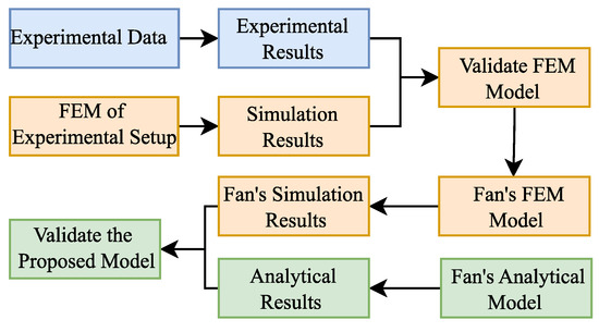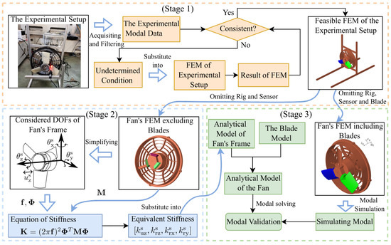 The procedure of the combined modeling for the cooling fan based on the experimental data and virtual prototyping. (Stage 1) indicates the process of obtaining the virtual prototyping based on the experiment, where the feasible FEM of the experimental setup is obtained by modifying boundary conditions to be consistent with experimental data and then the fan’s FEM excluding blades and including blades are derived; (Stage 2) indicates simplifying the fan’s frame-based FEM, where the fan’s FEM-excluding blades are employed to identify the mass, modal information, and stiffness of considered DOFs; (Stage 3) indicates the process of obtaining the feasible analytical model of the fan which is validated by comparing it with the fan’s FEM model. Orange, blue, and green elements correspond to Stages 1–3, respectively, and arrows indicate data flow between sub-models.