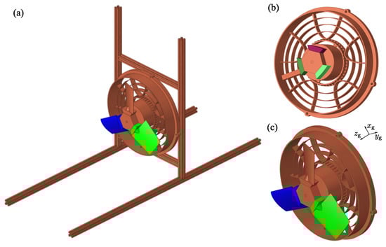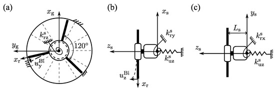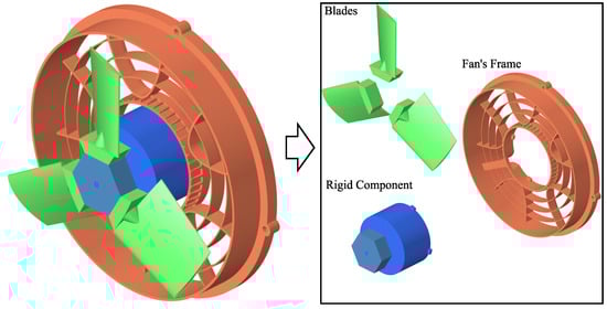 According to the modal result of fan shown in Figure 3, the DOFs dominated the movement of the fan, including rotational motions about the , , and axes, as well as translational motion along the axis, which are considered and denoted as , , , and . As shown in Figure 4, the fan is divided into three components, including blades, rigid components, and the fan’s frame. The blades and frame of the fan are regarded as the elastic bodies, while the rigid component assembled by the motor and coupling is considered the rigid body. Consequently, the stiffness associated with the fan’s frame, such as , , , and , are determined by the characteristics of the rigid component and frame.