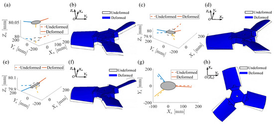 The modal shape results. (a,c,e,g) represent the 1st to 4th modal shapes obtained using the present method (The yellow dotted and solid lines respectively represent the centroid lines of one of the three blades before and after deformation, and the lines of other colors are similar.), while (b,d,f,h) depict the 1st to 4th modal shapes obtained through FEM.