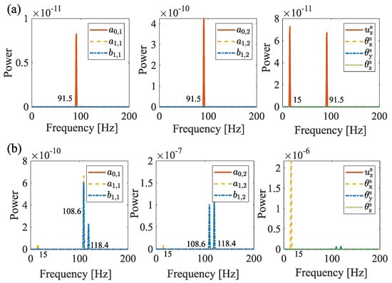 The spectrum of considered DOFs for excitations with , Hz. (a) Excitation acting on . (b) Excitation acting on .