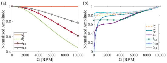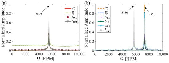 The amplitude responses within the operational frequency range are presented in Figure 9. To clearly illustrate the trend of the curves, normalized amplitudes are used in this figure. Although some curves overlap, this does not imply that their actual amplitudes are identical. As shown in Figure 9a, the amplitude of remains nearly constant under excitation applied at . In contrast, the amplitudes of the other DOFs within the symmetric group decrease with increasing rotational speed due to coupling effects. According to Figure 10, the natural frequencies of , , and are higher than the excitation frequency, with the variation in the natural frequency of being less pronounced than that of and . Consequently, and primarily influence the amplitude trends. Their amplitudes decrease as their natural frequencies diverge from the excitation frequency.