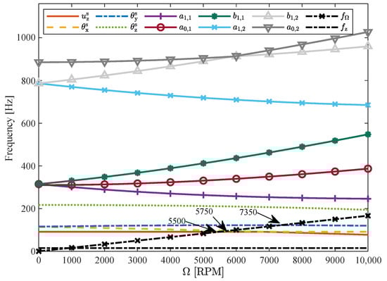 As shown in Figure 9b, the amplitudes of the asymmetric group increase with rising rotational speed when the excitation is applied to . According to Figure 10, the frequencies of , , and approach the excitation frequency as the speed increases, while the frequencies of , , and diverge from it. However, the amplitudes are primarily influenced by , , and due to their closer proximity to the excitation frequencies. Consequently, the amplitudes of , , and increase with increasing speed. Additionally, the amplitudes of , , and also rise due to coupling effects. Figure 9 further indicates that the excitation influences only the DOFs within the same group and has negligible impact on the DOFs of the other group, regardless of the rotational speed.