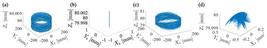 The trajectory of the blade tip at resonance is shown in Figure 13. The amplitudes at RPM and RPM are significantly larger than that at RPM, indicating the onset of asymmetric group vibration. Compared to Figure 11, the trajectory of the blade tip at resonance is simpler, due to the synchronization of frequency and phase. However, the amplitudes at resonance are notably higher than those observed at non-resonant frequencies.