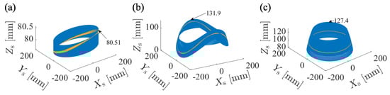 For the fan system, the blade state variables retain their physical significance after applying the multi-blade coordinate transformation. In a three-blade system, , , and correspond to the modal coordinates of the fan’s plane [33]. The associated modal shapes are illustrated in Figure 6, where (a), (b), and (c) represent the symmetric motion, asymmetric motion 1, and asymmetric motion 2, respectively.