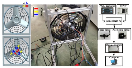 The experimental setup is shown in Figure 14, where the positions and orientations of the acceleration sensors are indicated. Sensors 1 to 3 are positioned at the rear of the electric motor to capture the maximum acceleration along the -axis, while minimizing the impact on the fan’s operation. Sensor 4 is placed on the bracket to monitor its vibration.