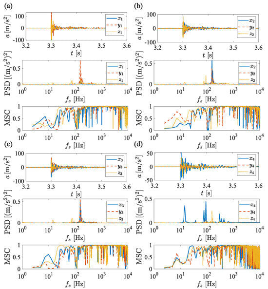 In the modal test, a hammer is used to excite the vibration of the experimental rig. The resulting vibrations are captured by the acceleration sensors and recorded through a data acquisition system. The processed data, shown in Figure 16, are then analyzed. A Butterworth filter, which is a linear filter that minimally alters the data’s coherence, is applied to the data with a passband frequency range set between 10 and 3000 Hz. The Power Spectral Density (PSD) and Magnitude Squared Coherence (MSC) of the filtered data are presented in Figure 16. The equation for the MSC is provided as follows: