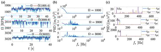 As shown in Figure 17a, the fan speed is adjusted to approach the target speed, but slight fluctuations are still present. The frequency of these fluctuations is below the lowest frequency of interest, 10 Hz, as depicted in Figure 17b. The fluctuations within the range of 0–10 Hz are removed using a Butterworth filter. Figure 17c illustrates the PSD of the acceleration at the three different speeds, where is defined as . For both RPM and RPM, the lowest frequency corresponds to , while for RPM, the lowest frequency is , and additional frequencies are present. This suggests that a different type of vibration is triggered at RPM.