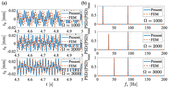 The FEM model with blades, as shown in Figure 2c, is used to obtain the results under the rotating speed , 2000, and 3000 RPM, respectively. These results are then compared with those from the analytical model, as depicted in Figure 18. The responses in both the time and frequency domains are found to be similar, thereby validating the reliability and applicability of the present model.