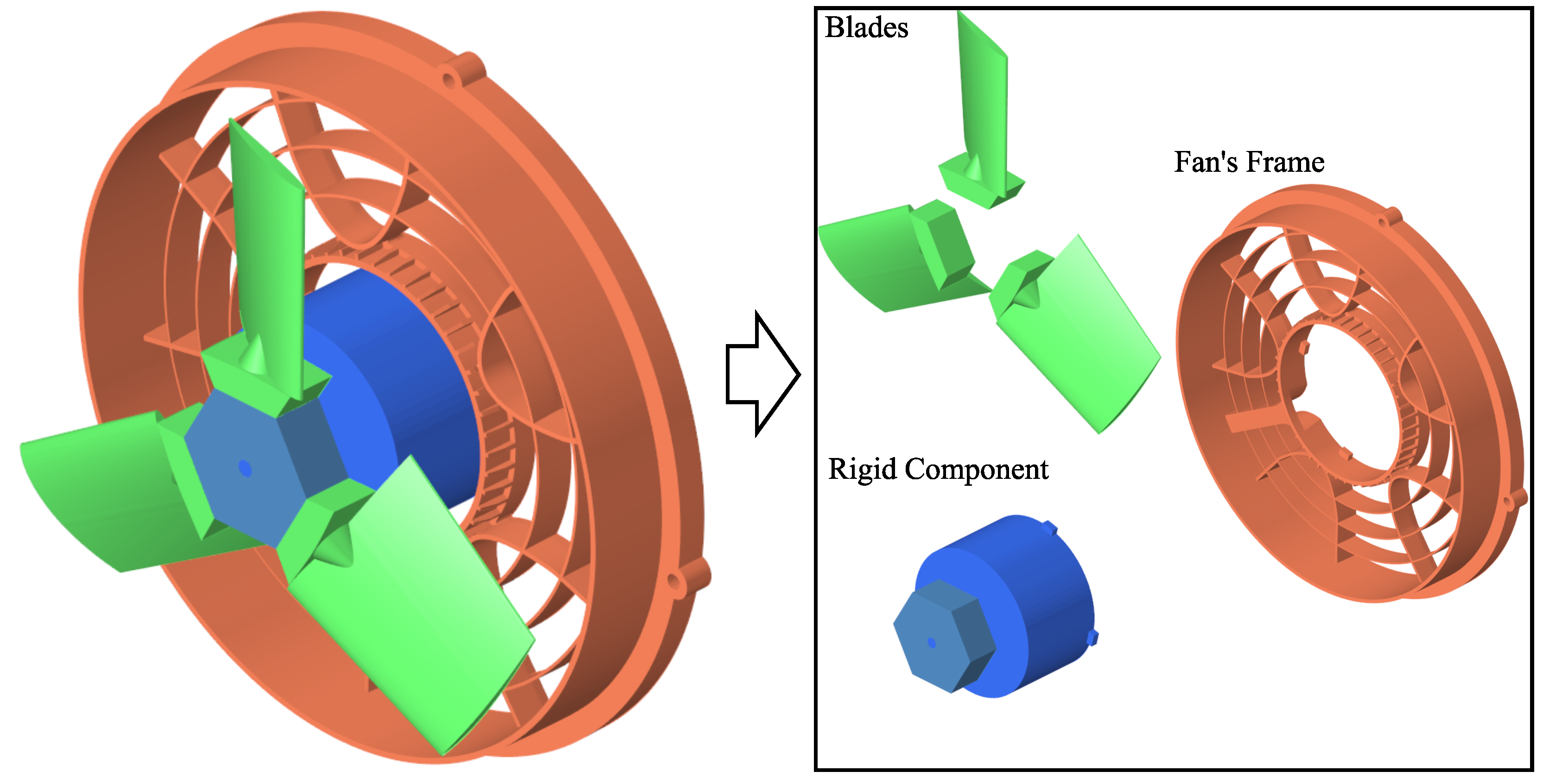 - We propose a combined modeling method for the cooling fan of new energy vehicles (NEVs). Virtual prototyping is employed to acquire critical parameters such as the equivalent stiffness of the fan frame, thereby resolving the challenge of simplified modeling for structurally complex cooling fans.