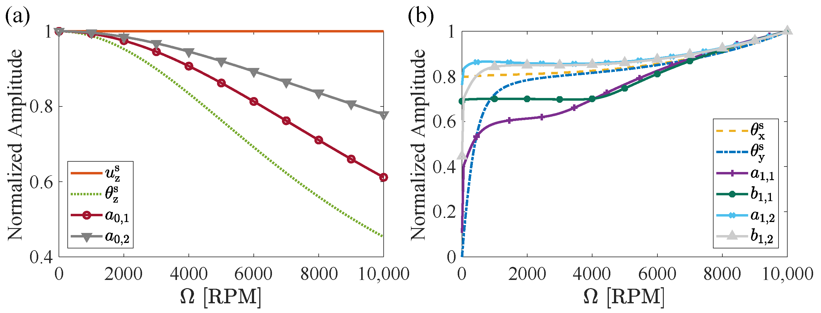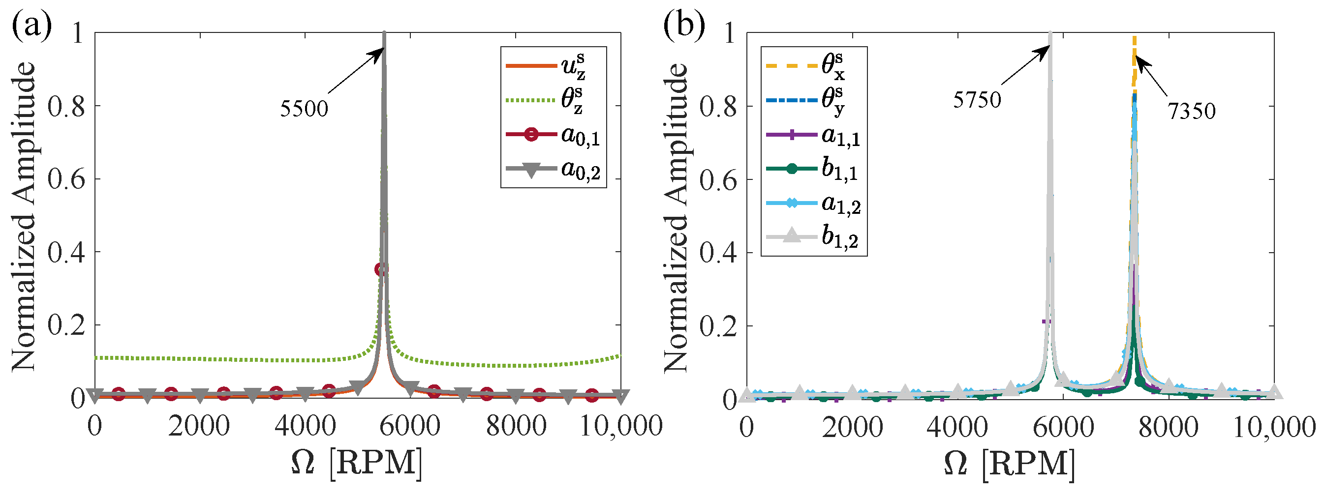 - The proposed methodology enables efficient generation of frequency-sweep response characteristics for the fan’s DOFs, including Campbell diagram visualization and rotational speed-dependent amplitude profiles. The results demonstrate that resonant phenomena remain confined within each respective DOF group (symmetric/asymmetric), exhibiting no cross-group coupling effects.
