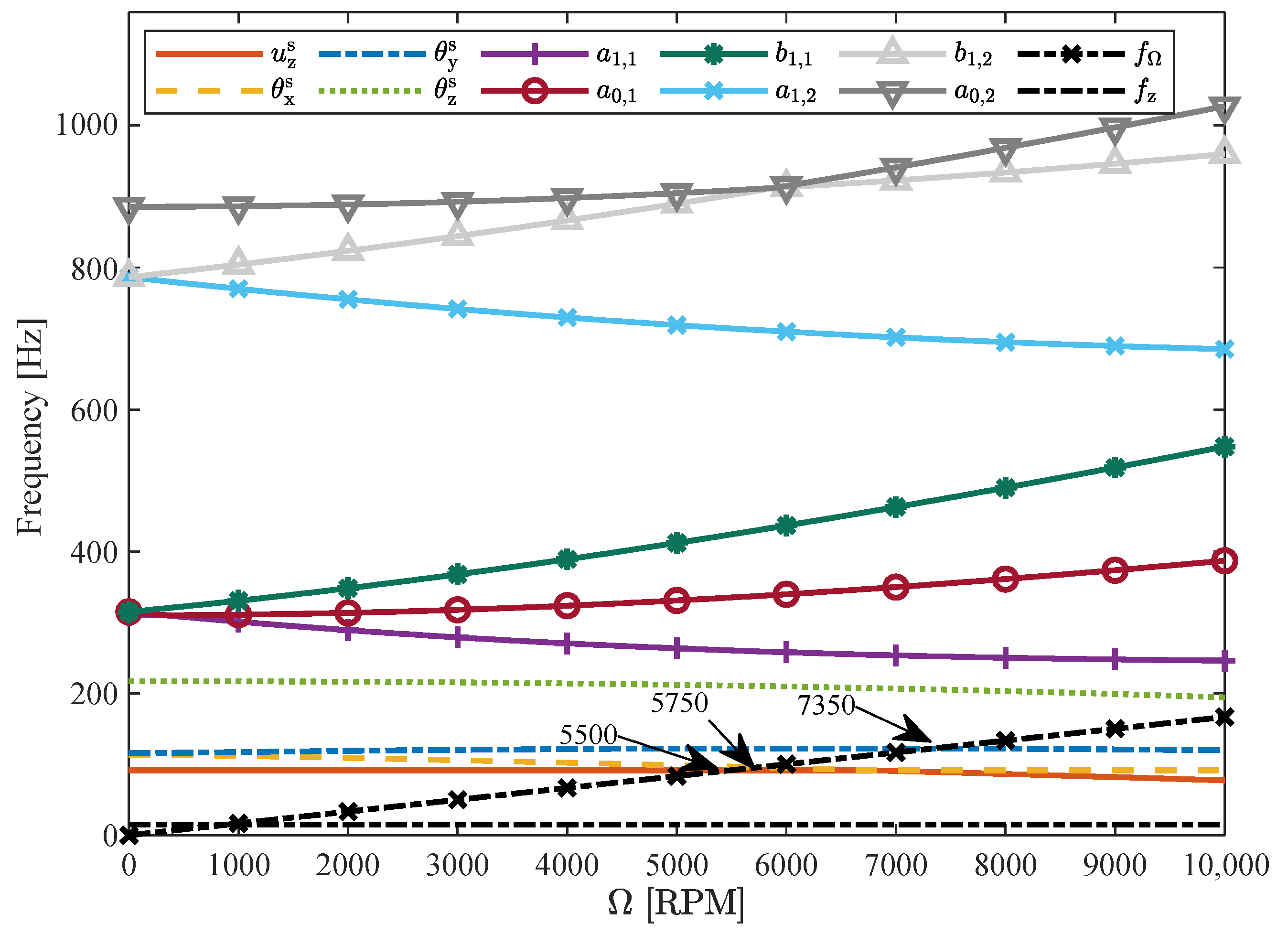 - Yang, C.H.; Huang, S.C. The influence of disk’s flexibility on coupling vibration of shaft–disk–blades systems. J. Sound Vib. 2007, 301, 1–17. [Google Scholar] [CrossRef]