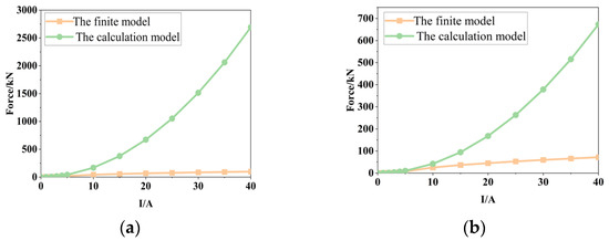 By employing both the original model and the modified model, the electromagnetic force of the maglev train is calculated under the condition where the air gap length is 12.5 mm and the excitation current varies from 0 to 25 A. This calculated electromagnetic force is then compared with the suspension electromagnetic force obtained through ANSYS finite element simulation, as illustrated in Figure 20, to validate the accuracy of the modified model.
