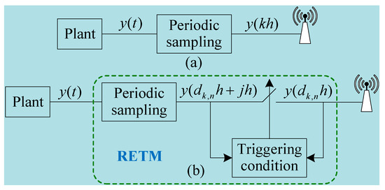 As shown in Figure 2(a), the classical periodic sampling communication mechanism (also called time-triggered communication) samples and transmits microgrid information using a fixed period h. As shown in Figure 2(b), the proposed RETM (also called event-driven communication) first periodically samples microgrid information, and then uses the current sampled value and the previously triggered value to determine whether the trigger condition (10) is met. If the condition is satisfied, the current sampled data will be transmitted to the controller via the network. Otherwise, the current sampled data will be discarded. Unlike the periodic sampling communication mechanism that transmits all sampled data, the RETM only sends sampled data that meets the triggering condition. The RETM can effectively reduce the data transmission rate, thus conserving limited system resources such as network bandwidth. However, under the RETM, the controller cannot periodically receive microgrid information, and thus the mature periodic sampling control theory cannot be directly applied to the controller design. In particular, under the influence of cyber attacks, the controller may fail to receive data or receive false data. Considering these factors, designing an EDDOFDF controller to ensure microgrid stability poses a challenge and represents the primary objective of this paper.