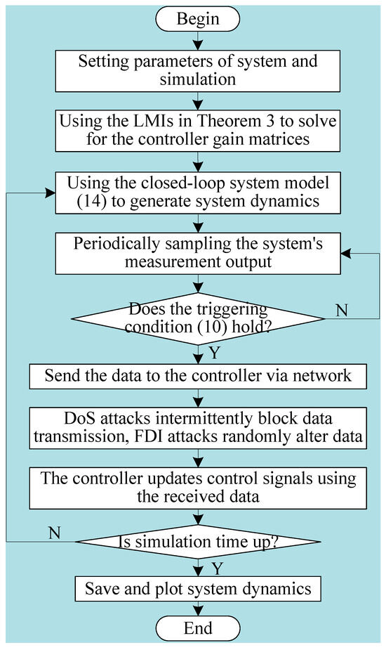 Using the MATLAB R2021a M-files, the simulation programs are developed, which mainly include an LMI solving program and a main program for system operation. As shown in Figure 3, using the LMI solving program based on Theorem 3, the gain matrices () of the EDDOFDF controller (13) can be obtained. In the main program for system operation, the closed-loop system model (14) generates system dynamics, the event-triggered condition (10) determines data transmission, impacts of DoS and FDI attacks are taken into account, control signals are updated with received data, the system model (14) is refined by introducing updated control signals, and this cycle iterates until simulation time is up.