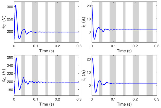 Figure 4 shows the state response of the microgrid, where the gray bands indicate active intervals of DoS attacks and the white bands denote sleeping intervals of DoS attacks. As shown in Figure 4, under the action of the designed EDDOFDF controller, the microgrid system can reach the equilibrium state. Namely, although the microgrid system is simultaneously affected by hybrid attacks, RETM, and noise, the designed controller can still stabilize it. For example, the voltage finally reaches its equilibrium point V. The control input (i.e., injection current ) of the microgrid system is shown in Figure 5. During active intervals of DoS attacks, control signals are blocked, and thus the injection current becomes zero. During sleeping intervals of DoS attacks, control signals can successfully arrive at the microgrid, and thus the injection current works well.