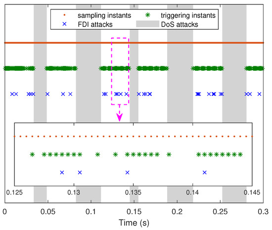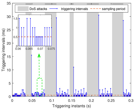 The triggering performance of the RETM is shown in Figure 6. During sleeping intervals of DoS attacks, the triggering rate of the RETM is , saving of communication resources. At the beginning of each attack-sleeping interval (e.g., s, s, s, s, s), an event is triggered immediately to transmit sampled data, which helps compensate for the damage caused by the just-ending attack-active interval. As shown in the detail view, the triggering intervals of the RETM are no less than the sampling period ms, and thus Zeno behavior is excluded. During active intervals of DoS attacks, the RETM does not trigger (i.e., no data is transmitted), which excludes the attack-induced dropout phenomenon.