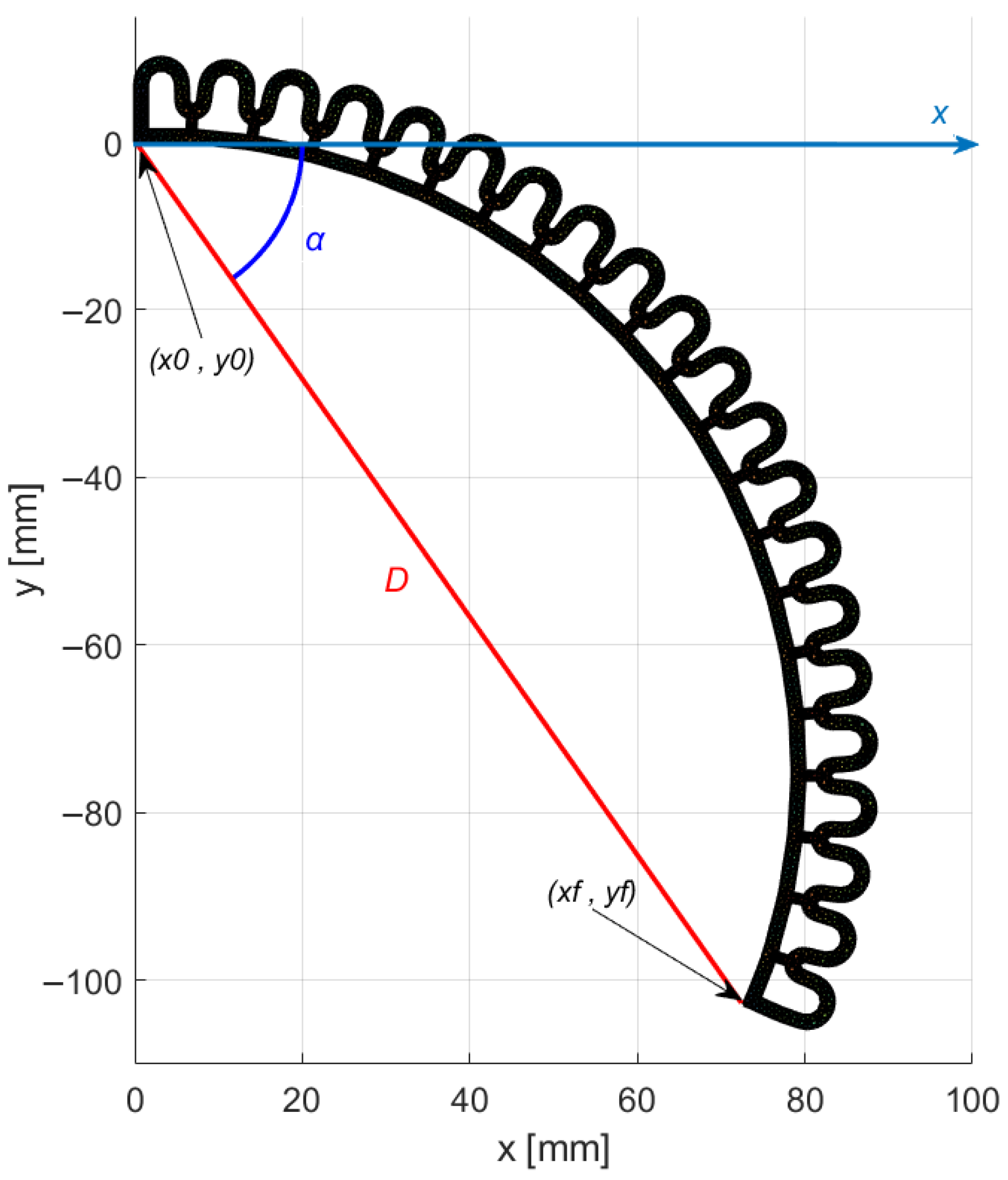 α is the bending angle measured between the fixed origin of the actuator and its tip point, where D is the distance between both points. They are calculated using Equation (13) and Equation (14), respectively.