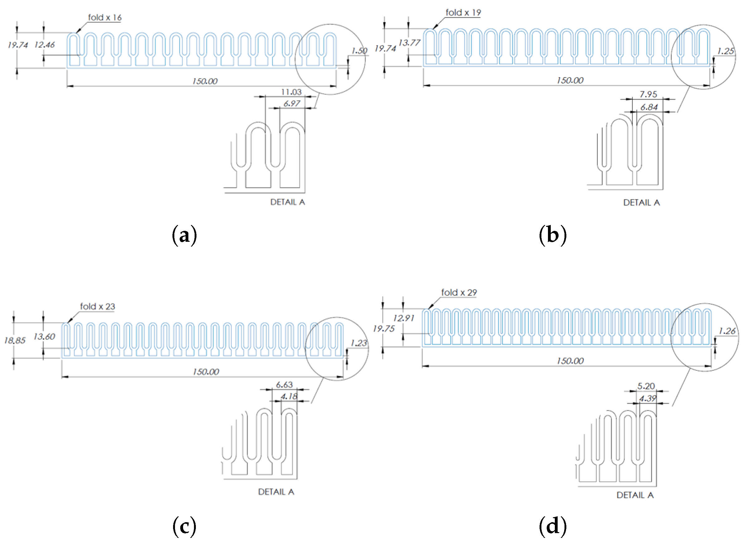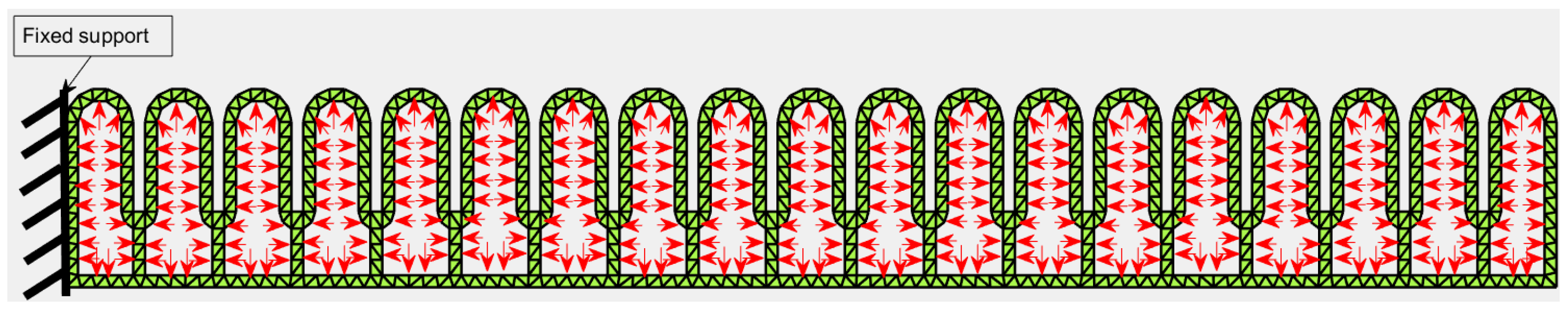 The bending capabilities of fluidic actuators are heavily influenced by the design parameters of their structure. Consequently, an efficient method for optimizing the bending angle of pneumatic actuators is highly preferred. Regarding this issue, Hu et al. [18] have investigated the effect of various design parameters on the bending capability of a pneumatic network actuator. Using a finite element method, several structural parameters of the actuator were evaluated in order to deduce an optimal performance of the actuator, under a specific actuation pressure. Keong and Hua [19] proposed a fold-based 3D printable soft bending actuator, apart from an experimental approach where they tested different possible designs towards several bending profiles. Wang and Hirai [20] have presented a workflow to optimize the chamber’s design of a bellows-type soft actuator using Abaqus and Isight software.