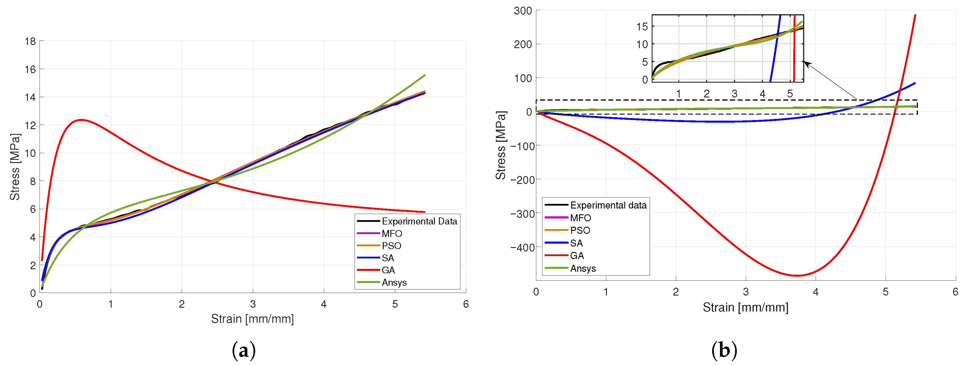 Table 6. Statistical analyses of MFO, PSO, GA, and SA performances for Ogden and Yeoh models curve fitting.