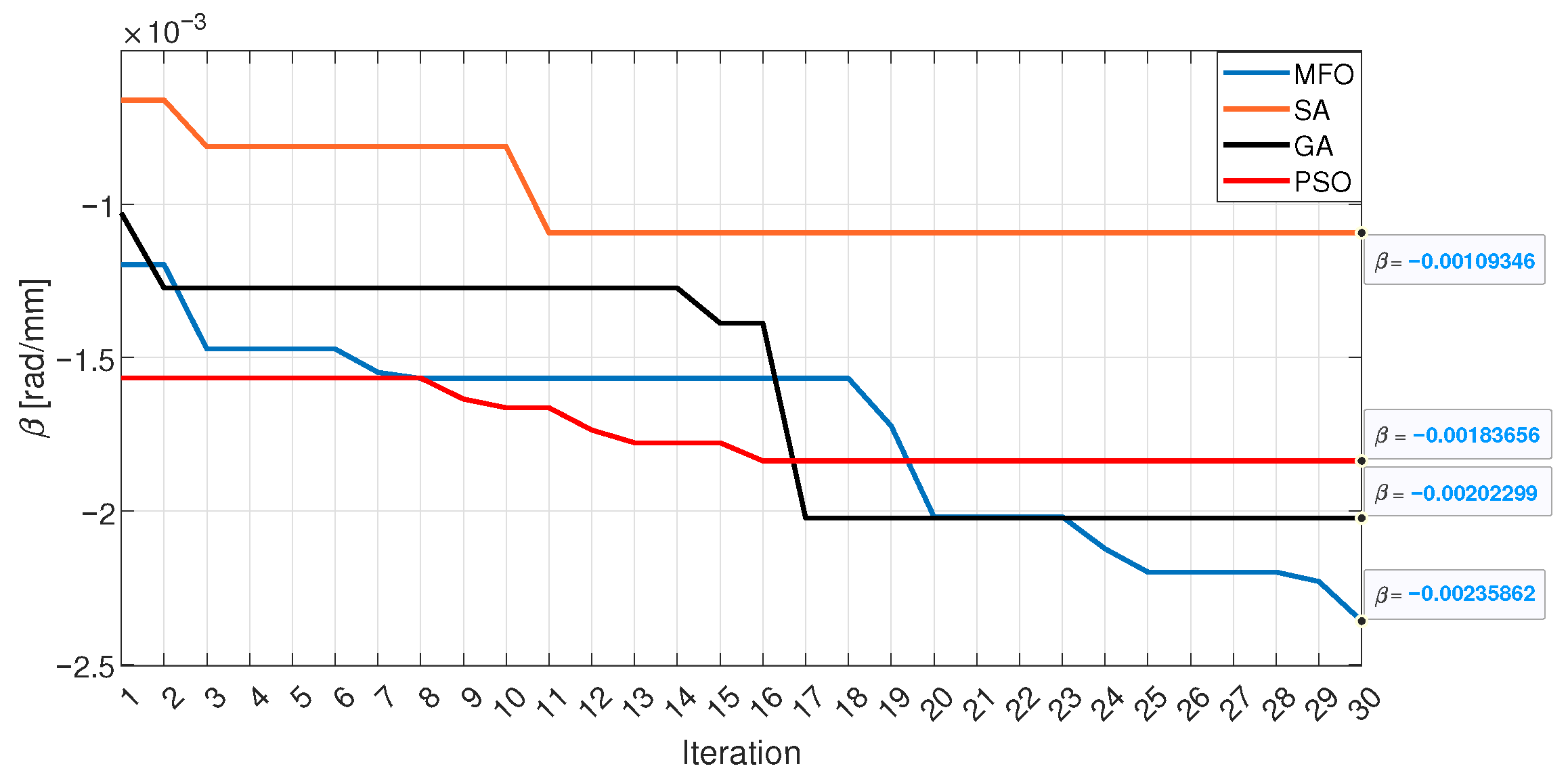 Given that β 0 (as per Equation (12)) and the configuration shown in Figure 2, maximizing the bending corresponds to minimizing β . Consequently, the optimization problem for the design geometry could be formulated as in Equation (15).