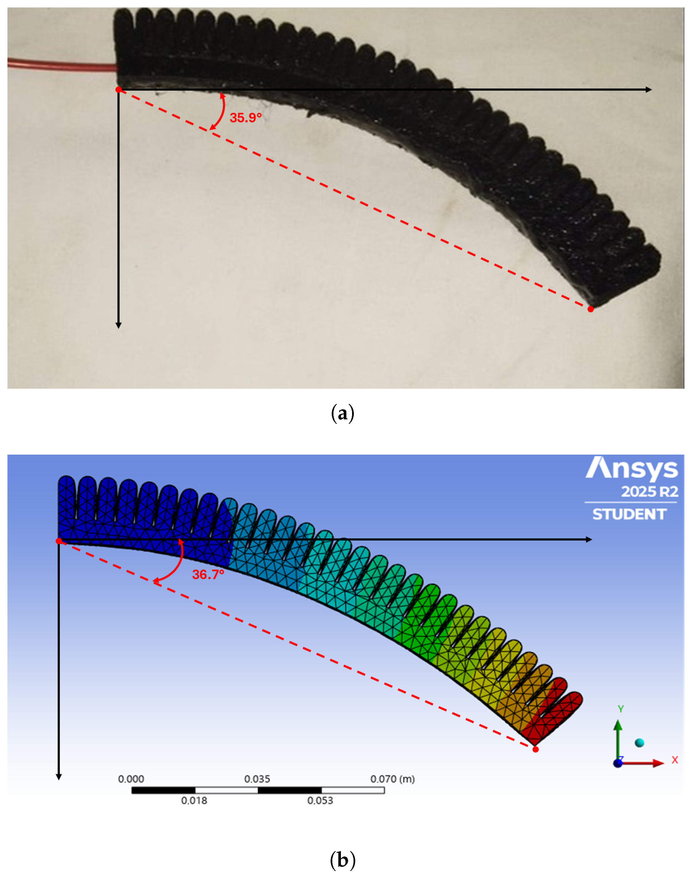 In our case, the objective function concerns the maximization of the bending of the soft actuator, which is evaluated using Equation (12):