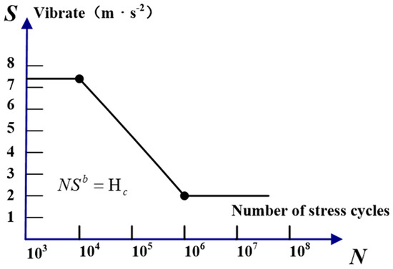 When the transport vehicle is in operation, there is minimal mutual friction between the surface layers of the moving and static contact bimetallic sheets of low-voltage electrical appliances in the electronic control system. This friction will cause tiny protrusions on the contact surface to squeeze and rub against each other, resulting in energy loss and temperature rise during this squeezing and rubbing process. This increase in temperature leads to material expansion, and thermal expansion of the contacts may change the contact pressure and contact resistance, resulting in variable loads. This change in load can also cause a rise in temperature, during which the contact system may experience fatigue due to mechanical vibration or arc effects, where the accumulation of fatigue can lead to the failure of low-voltage electrical contact systems. Here, the failure mechanism of the contact system is analyzed by introducing the fatigue damage theory model. This model incorporates a fatigue life degradation function to characterize the cumulative damage effect of load cycles [6]. The motion state of the transport vehicle can be simulated through a vibration test bench, and the functional relationship between the vibration stress and fatigue life cycles of the test bench is described by the S-N curve [7], which is the number of stress cycles to failure. Its expression is provided and can directly be used in fatigue analysis without needing to run a nonlinear optimization [8]. This curve shown in Figure 2 describes the average value of a series of tests. In Formula (1), S is the amplitude of vibration stress and N is the number of vibration stress actions that cause contact failure. The effective range in the S-N curve approximates a straight line in double logarithmic coordinates.