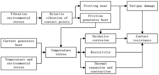 Under the action of temperature rise and vibration load stress, the corrosion and oxidation of contact bimetallic strips are the main reasons for the failure of low-voltage electrical contacts used in transport vehicles, while under vibration load, the reason for failure is micro-motion wear on concave and convex areas. Under the combined action of vibration, friction, and temperature changes, the heat generated by friction intensifies the corrosion and oxidation of the contact bimetallic strip. At the same time, the relative motion of friction leads to the rupture of the oxide film, exposing the metal contact material and continuing the oxidation reaction, shortening the contact life. The process of contact point failure caused by temperature and vibration is shown in Figure 4.