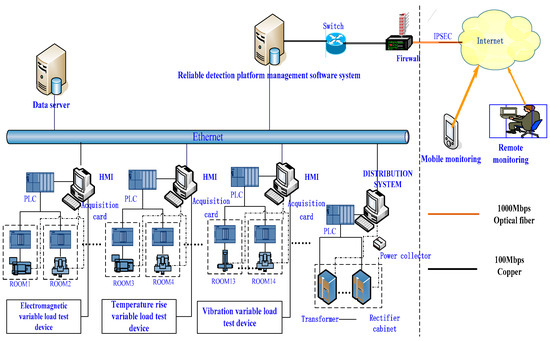 The research and design of a reliability testing platform for low-voltage electrical appliances used in transport vehicles mainly aim to evaluate and verify the performance and reliability of these appliances. The reliability testing platform is integrated with a management software system and a variable-load testing device. The overall plan of the testing platform is shown in Figure 5. The platform management software system includes a series of functions such as test parameter setting, test process control, test data collection, storage, query, printing, remote monitoring, fault alarm, and reliability evaluation. The variable-load test device includes a vibration variable-load test device, an electromagnetic variable-load test device, a temperature rise variable-load test device, etc., where vibration variable load is the main influencing factor on the reliability of low-voltage electrical appliances used in transport vehicles.