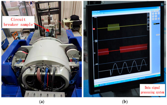 Taking circuit breaker detection as an example, its contact current and voltage data contain rich electrical performance characteristic information, which can be used to evaluate and predict the remaining life of the circuit breaker. The electrical life of circuit breakers is generally long, so their failure tests take a long time. In order to quickly collect failure test data, the accelerated life method is adopted to shorten the failure test schedule. Detection parameters are set according to the national standard GB/T14048.1-2023 [29] “Low voltage switchgear and control equipment”, and the parameter settings for the accelerated test are shown in Table 1. The circuit breaker is installed on the vibration table as shown in Figure 6a. During the test, the management software system collects variable-load current and voltage data as shown in Figure 6b. The data collected during the experiment includes action time, bounce frequency, bounce time, contact pressure, arc time, coil voltage, coil current, arc time, breaking current, contact resistance, arc energy, pull-in time, cumulative arc energy, trigger time, release voltage, contact voltage drop, release time, rebound time, over travel time, and the power factor, a total of 20 characteristic parameter data categories.