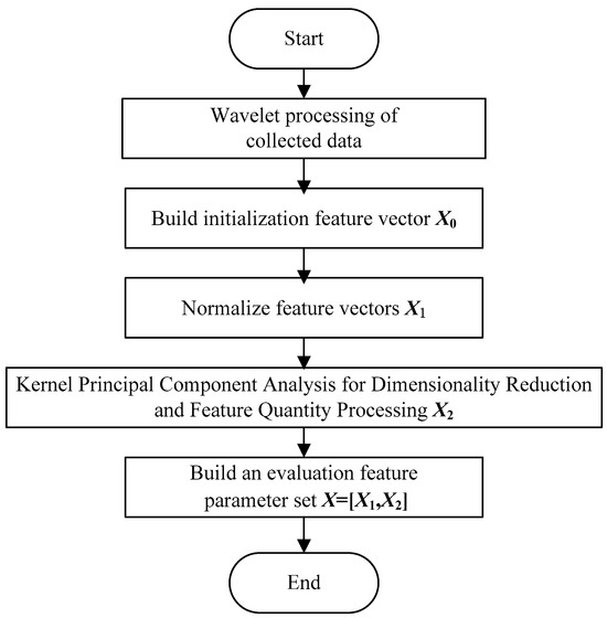where x is the original data, min (x) is the minimum value in the data, max (x) is the maximum value in the data, and is the normalized data. Using kernel principal component analysis to reduce the dimensionality of feature parameter X0, kernel principal component X2 is obtained. The feature quantity X1 = and the kernel principal component X2 are merged to construct the full feature quantity X, that is, . The construction process of parameter set X for reliability evaluation of low-voltage electrical appliances based on variable-load operation tools is shown in Figure 7: