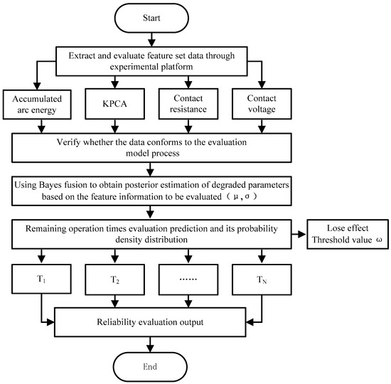 The analysis of experimental data shows that the optimal evaluation parameters are the cumulative arc energy, nuclear principal components, contact resistance, and contact voltage drop, with a cumulative arc energy failure threshold of ω = 1,076,392. The evaluation and prediction process based on the variable-load data-driven model is shown in Figure 8. Experiments are conducted on any selected validation sample; accumulated arc energy, nuclear principal components, contact resistance, and contact voltage drop test data are collected and processed using a reliability testing platform; and the constructed evaluation dataset is input into the reliability evaluation model. The evaluation prediction results are shown in Table 5.