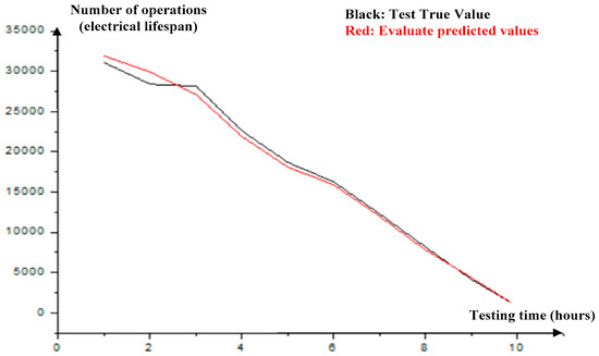 Based on the data in Table 5, the predicted values of the model evaluation are compared with the actual test values as shown in Figure 9. The black and red curves in Figure 9 represent the actual test value and the model evaluation prediction value, respectively. The black and red curves are close, indicating that the model evaluation prediction value is consistent with the actual test value, which verifies the high reliability of the evaluation results based on variable-load data-driven models.