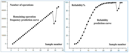 The reliability assessment model is applied to the reliability testing platform management software system, 32 samples of circuit breakers are randomly selected for transport vehicles, and their remaining operation times are predicted through experiments. The prediction results are shown in Table 6, and the reliability is calculated according to Formula (44). According to the table, there are 1000 remaining operations for the predicted sample, and the reliability is close to 0, indicating that the sample has failed. The remaining number of operations for the predicted sample is around 14,000, with a reliability of approximately 60%. If this remaining number of operations is around 30,000, and the reliability of the sample is close to 100%, the product reliability can fully meet user needs.