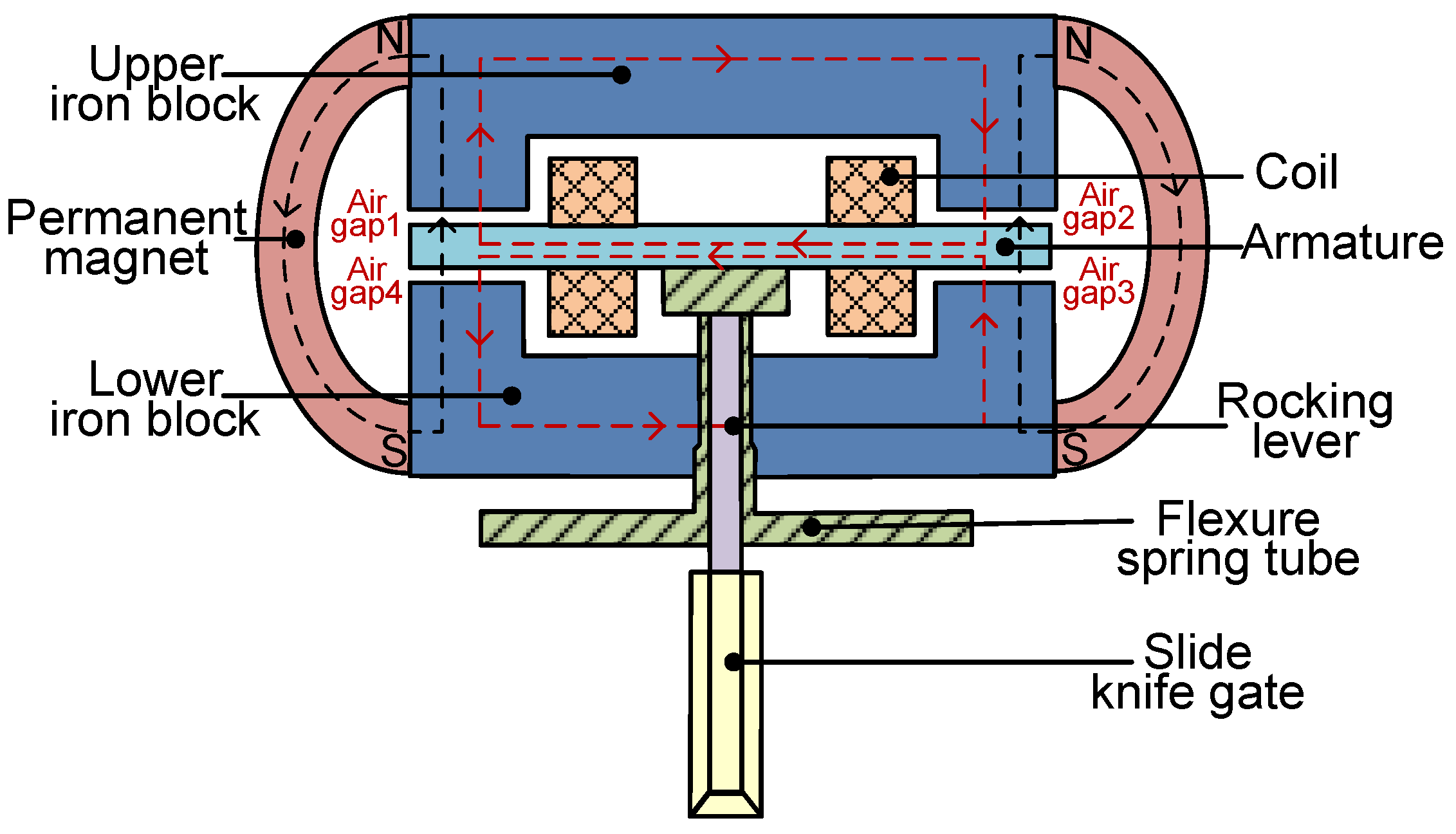 - Zhang, Q.; Yan, L.; Duan, Z.; Jiao, Z.; Gerada, C.; Chen, I.-M. High torque density torque motor with hybrid magnetization pole arrays for jet pipe servo valve. IEEE Trans. Ind. Electron. 2019, 67, 2133–2142. [Google Scholar] [CrossRef]