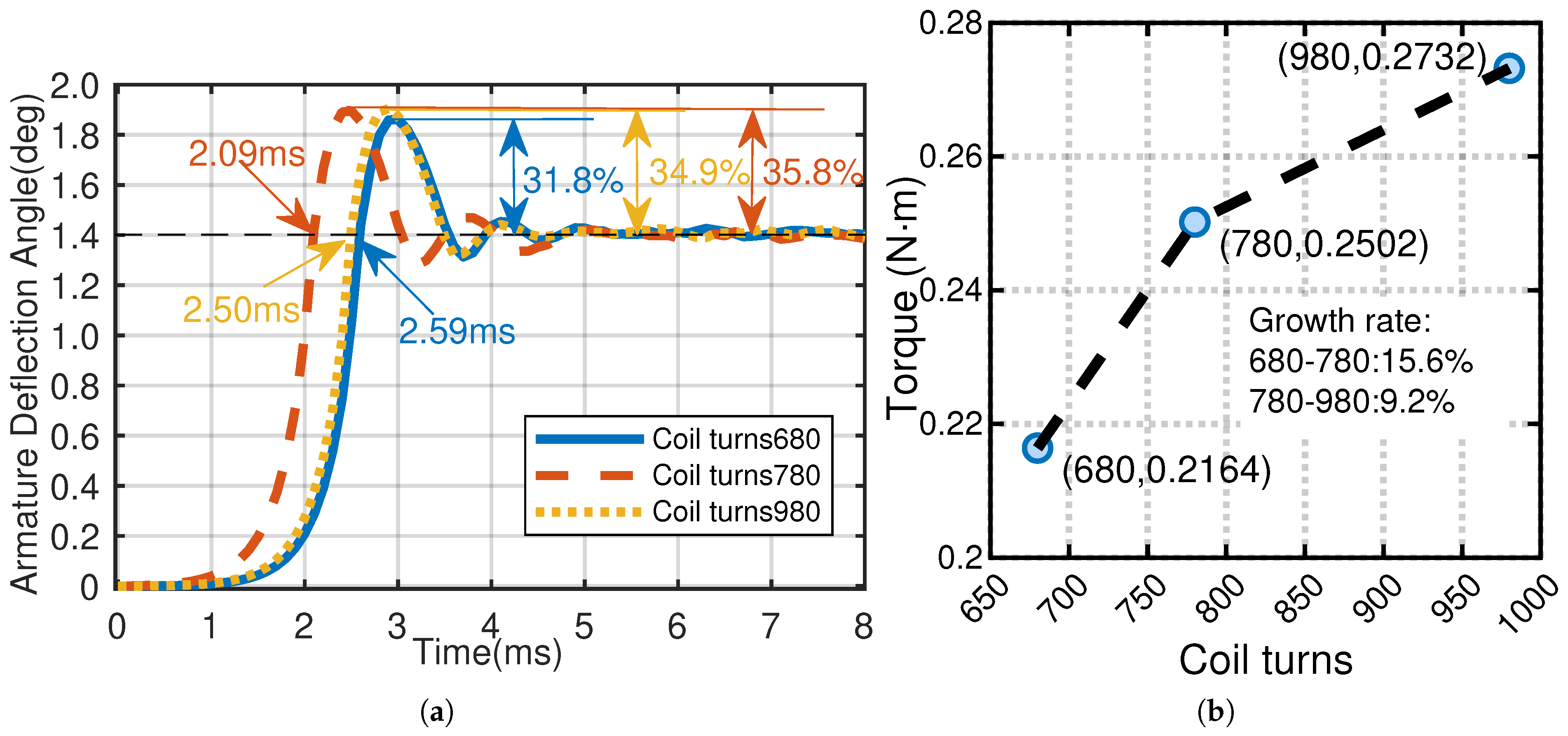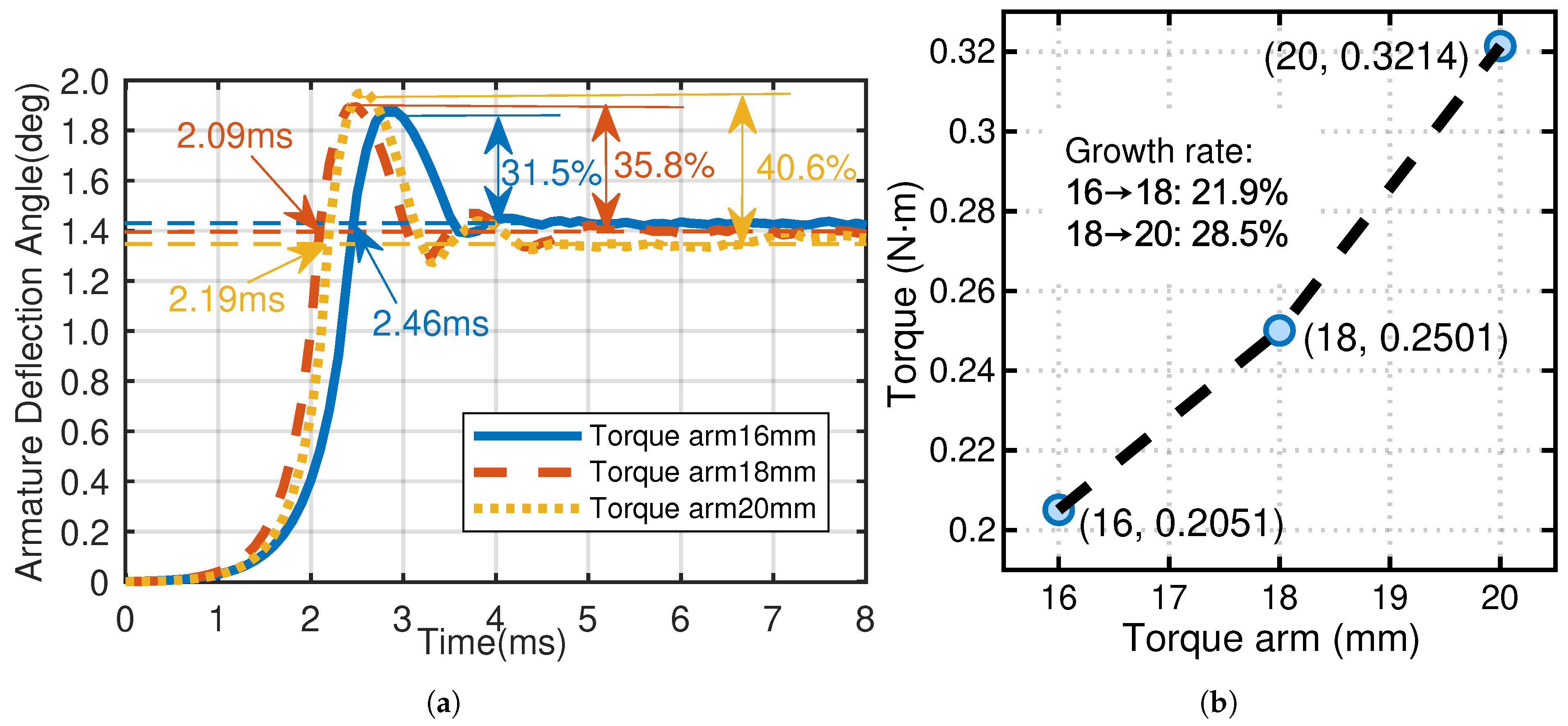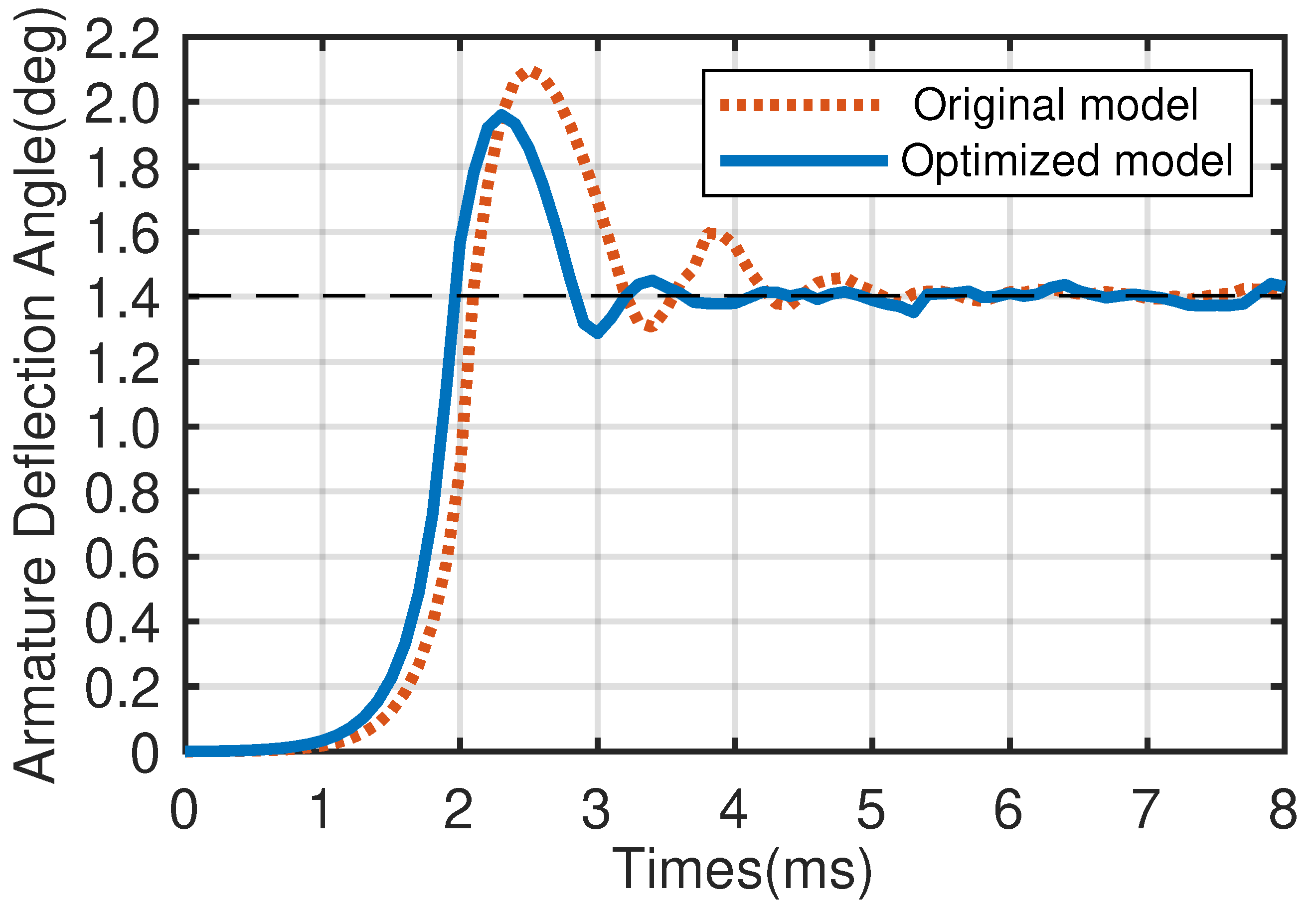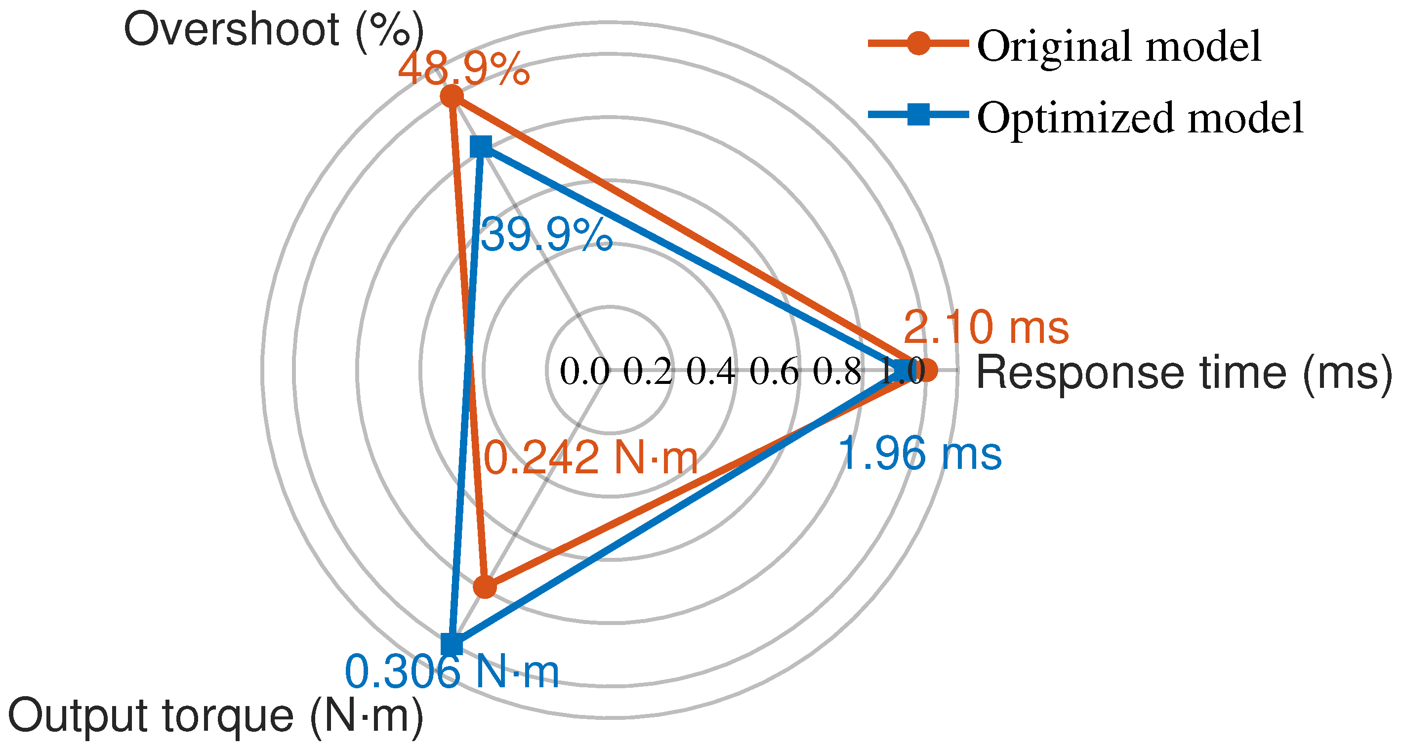 - The multi-objective GA is used to optimize the torque arm, air gap, and coil turns, resulting in a 20 mm arm, a 0.71 mm gap, and 980 turns. The output torque increases by 26.4%, the overshoot is reduced by 9%, and the response time decreases by 0.14 ms. Significant effectiveness is achieved.