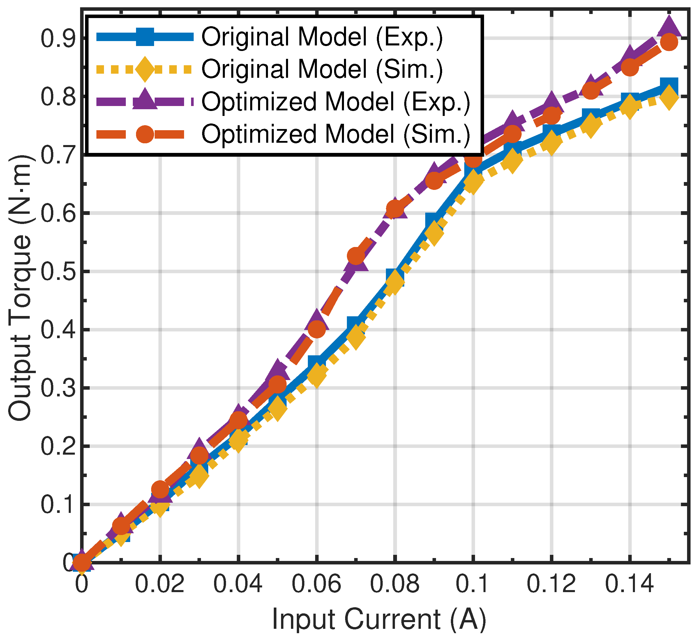 - Experimental results conclusively demonstrate that the optimized model significantly enhances both the static and dynamic characteristics of the torque motor, quantified by a 26% increase in output torque and an average 7.1% reduction in response time. The strong agreement between the experimental data and simulation results further validates the accuracy of the theoretical models. Consequently, this paper provides insights into the design of torque motors for aerospace servo valves and the optimization of high-frequency servo valve performance.