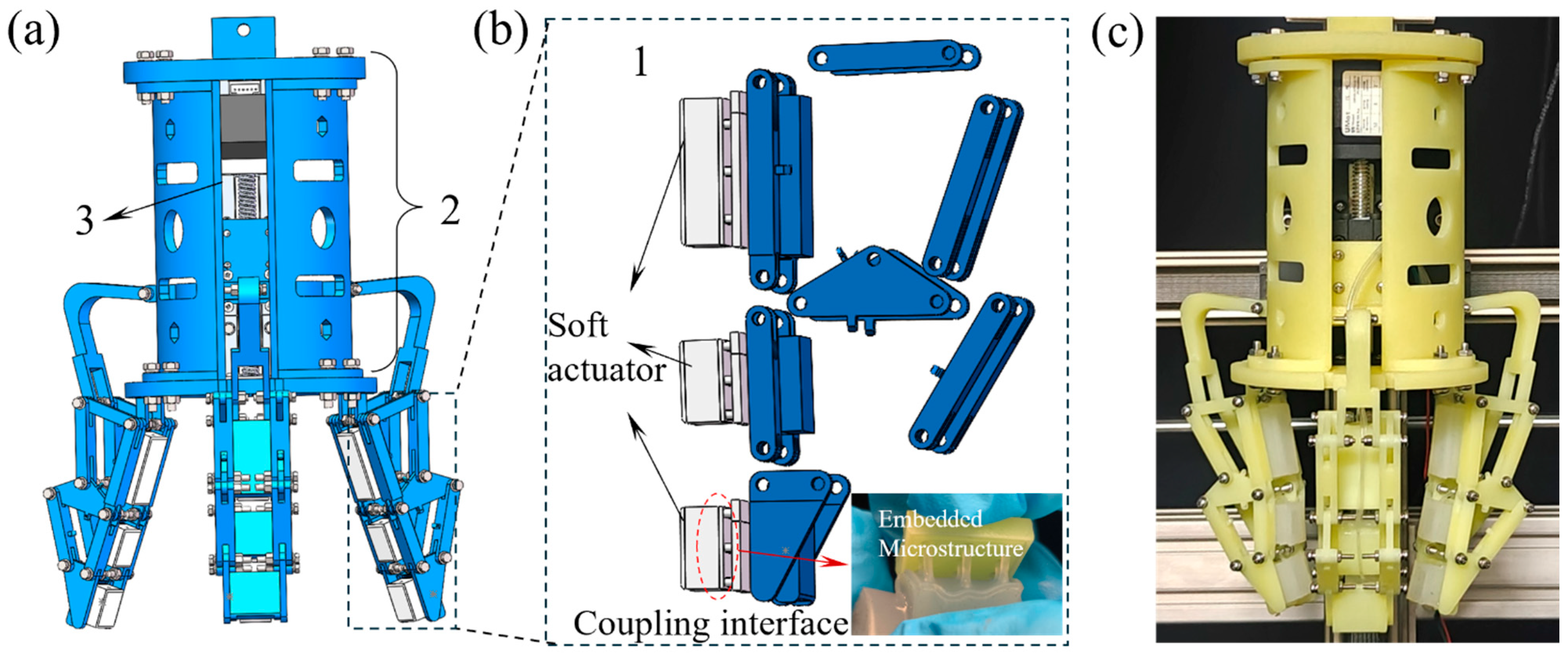 Figure 1c shows a physical prototype of the rigid–flexible coupling gripper, which exhibits a compact structural design and demonstrates successful integration between the rigid and flexible parts.