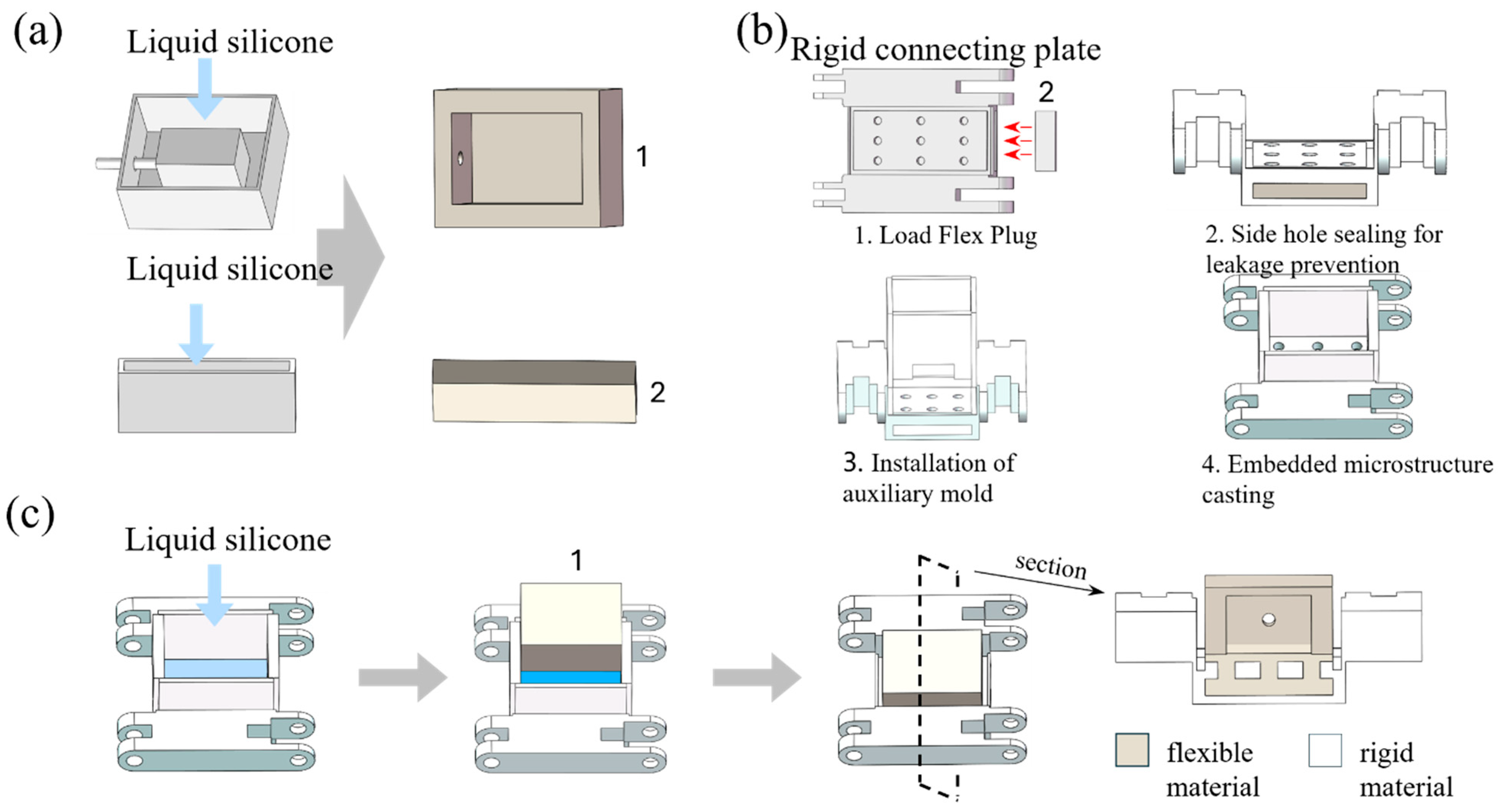 Figure 2b shows the mold assembly process for the embedded microstructure. Four 3D-printed auxiliary molds (plate structures) with snap-fit ends are installed into the grooves of the connecting plate. This internal mold assembly is used to contain the liquid silicone during casting. The mixed liquid silicone is then poured into the assembled mold. Prior to curing, silicone infiltrates the internal cavity of the porous connecting plate through its holes under gravity. The flexible plug and auxiliary molds effectively prevent leakage. After curing at room temperature and demolding, the embedded microstructure is fully formed.