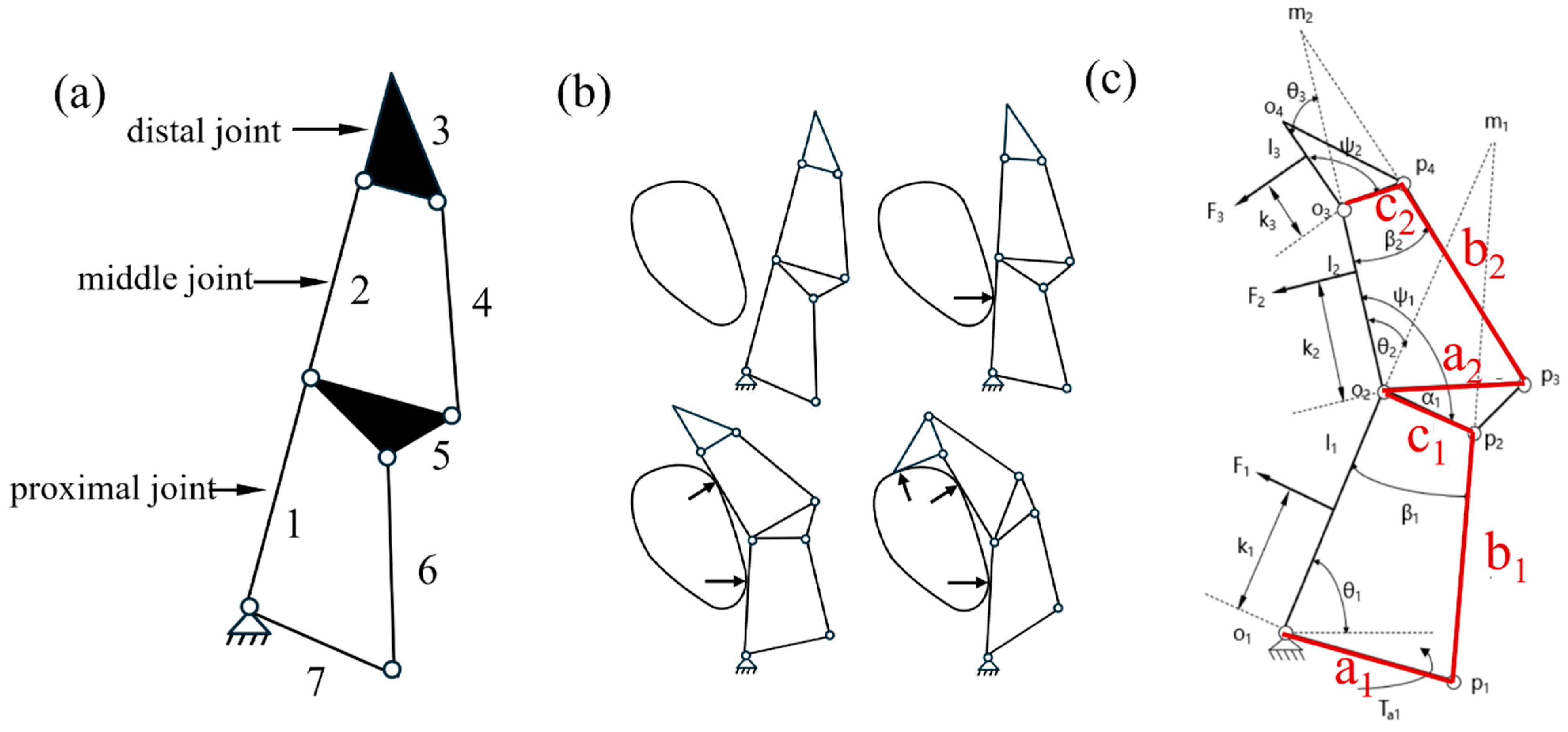 Figure 4a, a schematic of the multi-phalanx underactuated structure, the mechanism consists of links 1, 2, 4, 6, and 7, along with triangular plates 3 and 5, where link 7 serves as the driving link.