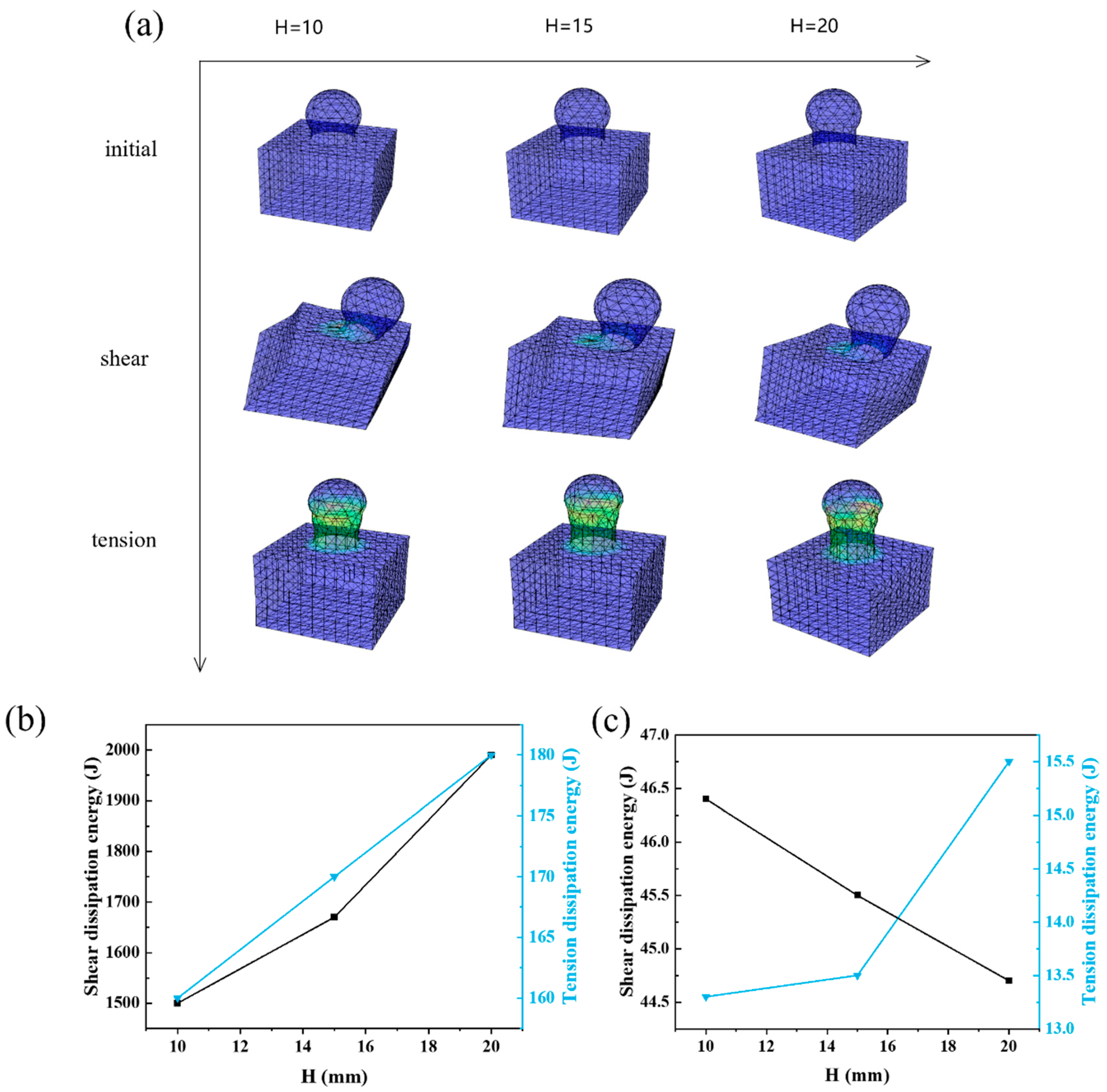 Figure 7a compares the shear and tensile simulation outcomes across multiple values of H, which illustrates the deformation trends of the microstructure under both tensile and shear loads for a fixed diameter (R). Analysis of the results in
