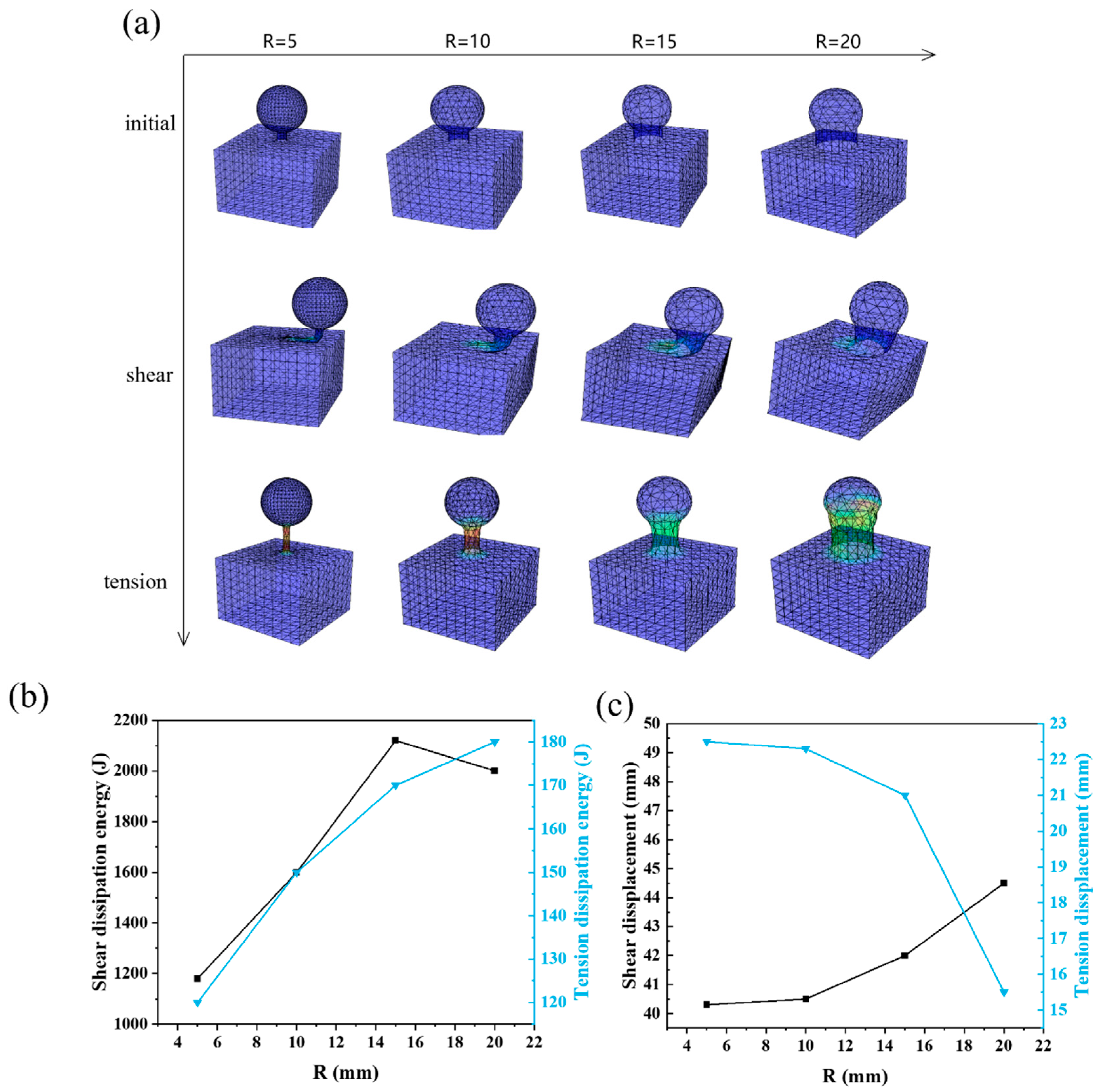 Figure 8a presents the shear and tension simulation results for multiple groups of microstructures with different R parameters. The simulation results in