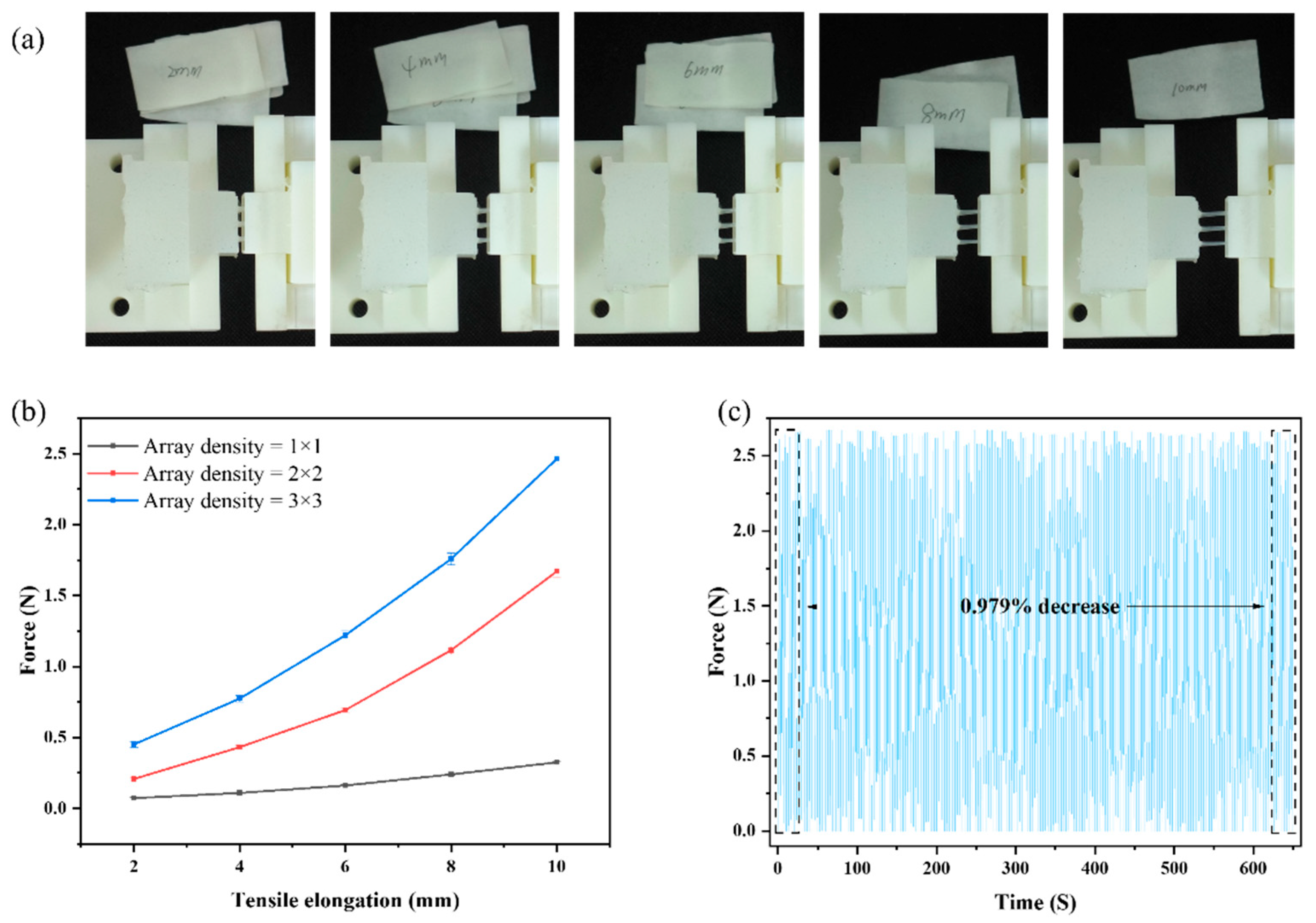 Figure 9c, we conducted tensile-recovery fatigue experiments on a 3 × 3 array of microstructures with both radius R and height H of 2 mm. The test adopted a tensile-recovery cycle of 2.5 s, a tensile length of 8 mm, and test duration of 650 s. We selected the average tensile force from the first 10 cycles and the last 10 cycles for calculation, and the results showed that the tensile force decrease was 0.979% after 650 s of cycling. This indicates that the flexible microstructure has good fatigue strength.