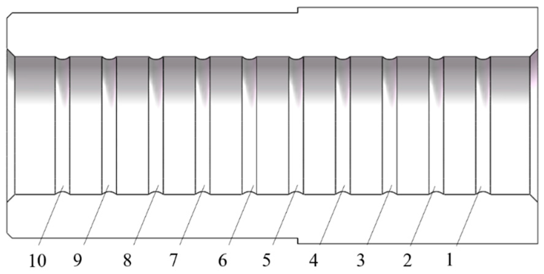 The sealing capability depends on the pressure generated by the contact between the annular protrusions and the pin. The 10 sets of annular protrusions inside the entrance casing are labeled sequentially from 1 to 10, starting from the entry (