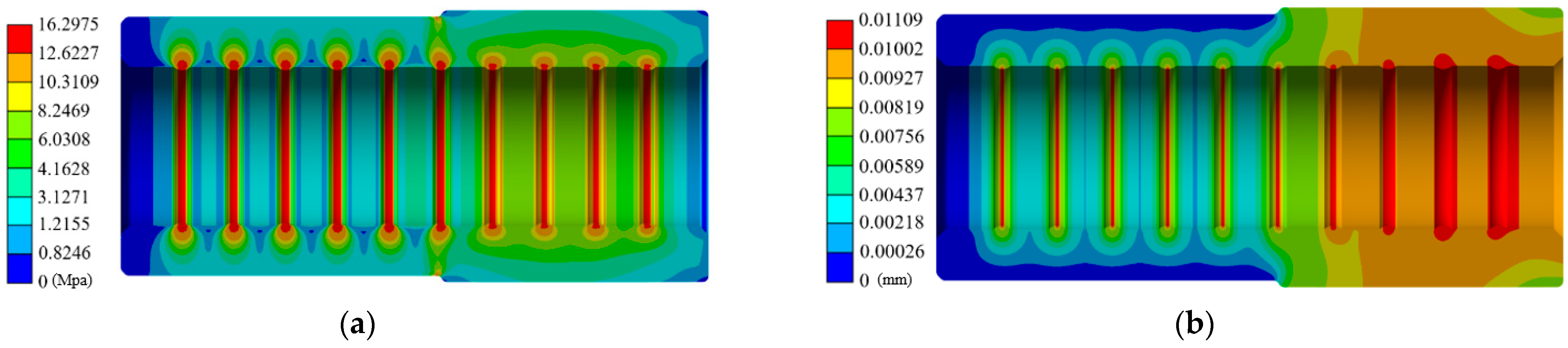 Figure 10a, the maximum contact pressure inside the sleeve occurs at protrusions 6 and 7, with values exceeding 7.5 MPa, meeting the sealing requirements. The contact pressure of protrusions 6–10 is slightly higher than that of protrusions 1–5, indicating that the right-side annular space design plays a buffering role in pressure and bears significant equivalent stress and deformation. The left side, with higher and stable contact pressure, forms the primary sealing area, improving sealing reliability.