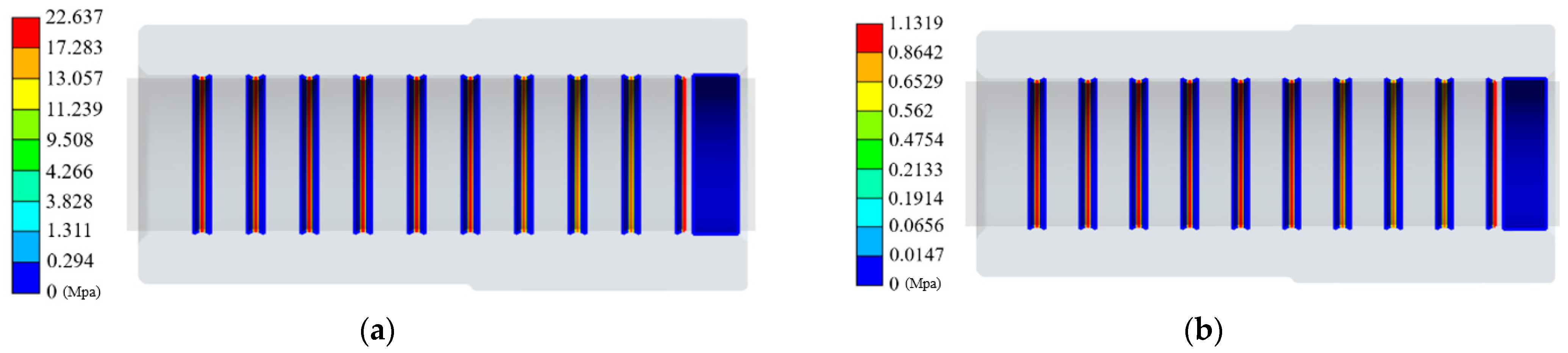 To ensure sealing reliability, the equivalent stress must remain below the rubber material’s yield strength of 25 MPa. At a radial expansion of 0.025 mm, the equivalent stress for the circular protrusion reaches 25.17 MPa, exceeding the yield strength. For the trapezoidal protrusion, the equivalent stress at a radial expansion of 0.02 mm during insertion reaches 25.24 MPa, also exceeding the yield strength. These conditions do not meet the working requirements. While increasing radial expansion improves contact pressure and dynamic sealing performance, excessive compression raises equivalent stress and risks structural failure. Considering both sealing performance and material yield strength, a radial expansion of 0.02 mm for the circular protrusion or 0.015 mm for the trapezoidal protrusion should be selected to ensure safe and reliable dynamic sealing.