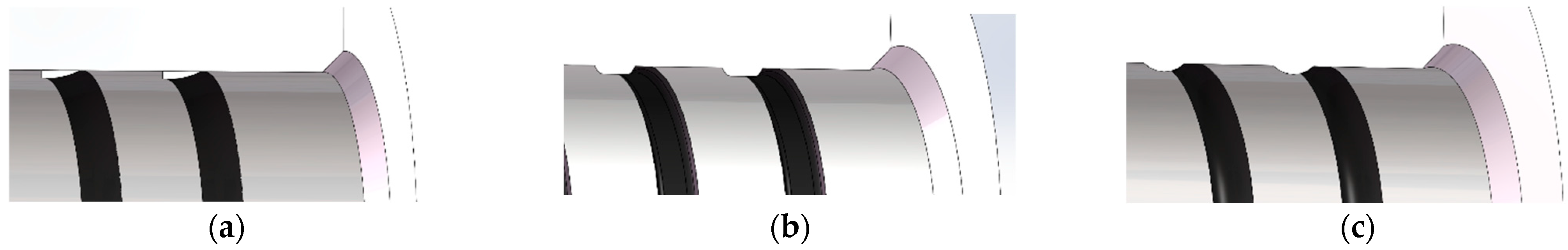 Figure 5 illustrates the dynamic sealing structure. The entrance casing, as the core sealing component, achieves dynamic contact with the sleeve and pin through an interference fit design. The inner diameter of the entrance casing is matched with the outer diameter of the corresponding components to generate a preset interference fit. Additionally, during the installation of the entrance casing, it is subjected to radial load from the external housing, which creates an initial contact pressure