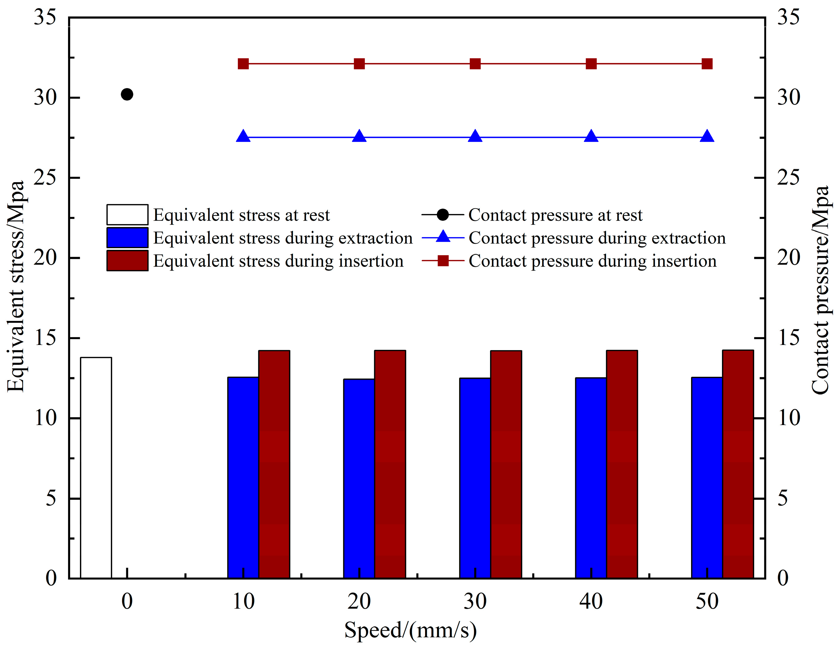 Figure 13, the contact pressure at the protrusion position inside the entrance casing remains largely unchanged across the five different insertion/extraction speeds. The equivalent stress fluctuates by no more than 0.2 MPa during both insertion and extraction. The contact pressure during extraction stabilizes at 27.5 MPa, while during insertion it stabilizes at 32.1 MPa, with the resting pressure at 30.2 MPa. The maximum equivalent stress on the inner side of the entrance casing is higher during insertion than extraction, with the resting value at 13.8 MPa, between the insertion and extraction values. In conclusion, insertion/extraction speed has minimal impact on both equivalent stress and contact pressure. Additionally, at all speeds, the contact pressure during extraction is lower than during insertion, making dynamic sealing performance during extraction weaker than during insertion, thus representing the weaker link in the mating process.