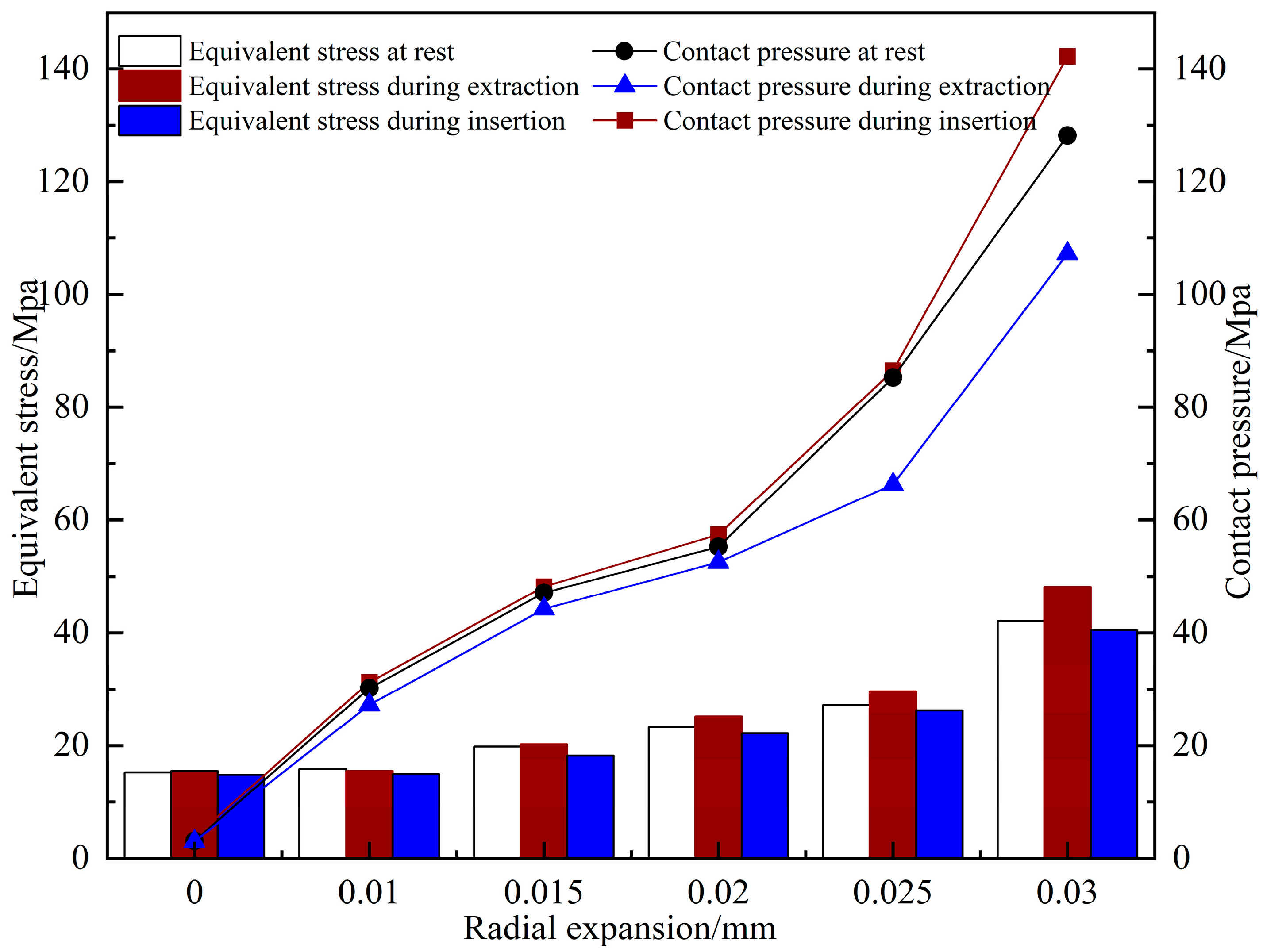 Figure 14, as the friction coefficient increases, the contact pressure of the dynamic seal gradually rises during both insertion and withdrawal. With friction coefficients of 0.05, 0.1, 0.15, 0.2, and 0.25, the insertion contact pressure increases from 31.13 MPa to 31.57 MPa, and the withdrawal contact pressure increases from 27.19 MPa to 27.35 MPa, with the static pressure stabilizing at 30.21 MPa. The equivalent stress on the inner wall of the entrance casing stabilizes at 14.83 MPa, 14.22 MPa, and 13.53 MPa during insertion, static, and withdrawal states, respectively. In summary, an increase in the friction coefficient enhances the contact pressure during the dynamic process, thereby improving dynamic sealing performance. However, changes in the friction coefficient have minimal impact on the stress conditions of the entrance casing.