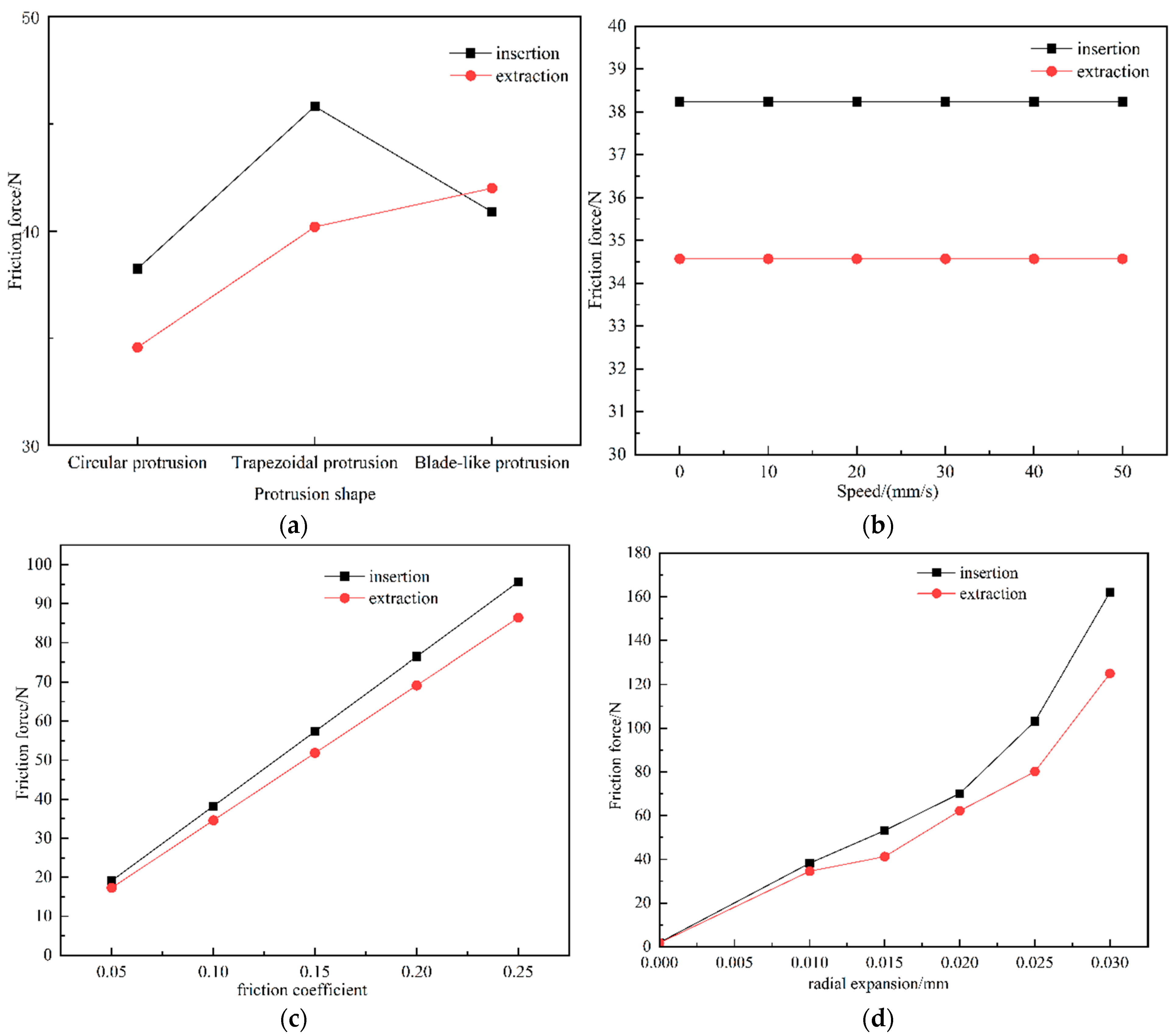 Figure 17, the trapezoidal protrusion, due to its larger contact area, generally generates more frictional force than the circular protrusion. The blade-shaped protrusion experiences damage during the extraction process and will not be considered further. Frictional force is influenced by both contact pressure and the friction coefficient, and they are positively correlated. The insertion/extraction speed has no significant effect on the frictional force, while an increase in Radial expansion significantly enhances the frictional force.