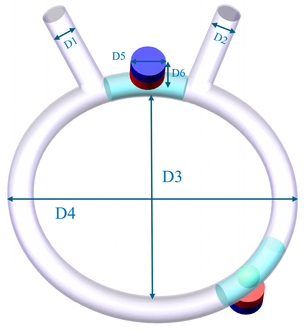 Table 1. The pump chamber channel adopts a circular ring structure, which is more conducive to achieving the reciprocating circulation function of the micropumping device. The fixed permanent magnet (FPM) is placed above the static ferromagnetic fluid plug (SMP) of the annular micropump. A rotating permanent magnet (RPM) driven by a motor is placed below a dynamic ferromagnetic fluid plug (DEFP). Red represents the N direction, and blue represents the S direction.